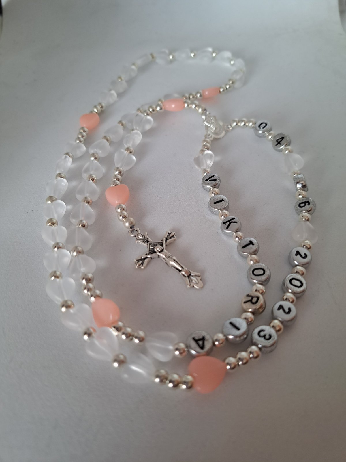Ruženček z fosforových (svietia v tme) korálok v tvare srdca veľkostí 4-8mm. Rada prevedenie zlaté alebo strieborné tiež farby prispôsobím pre vás...