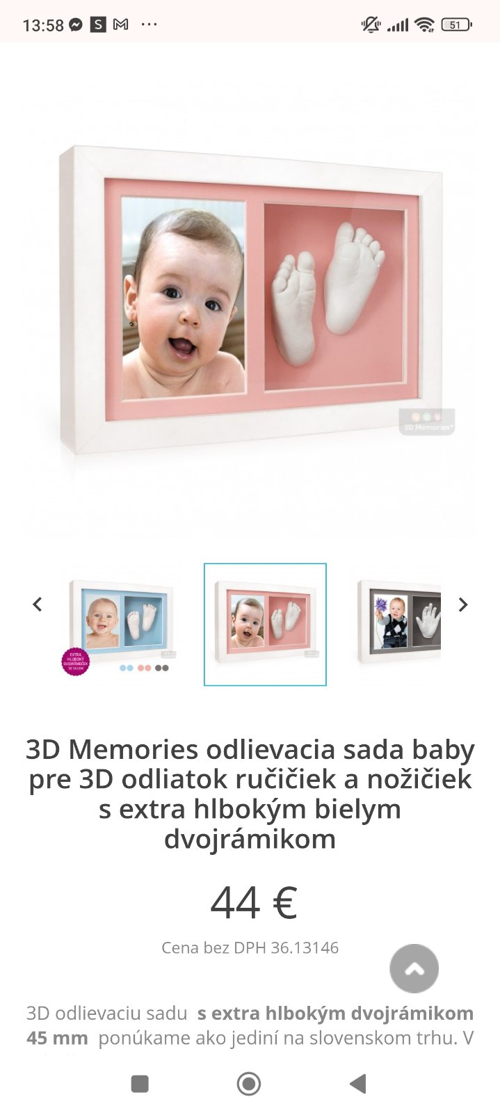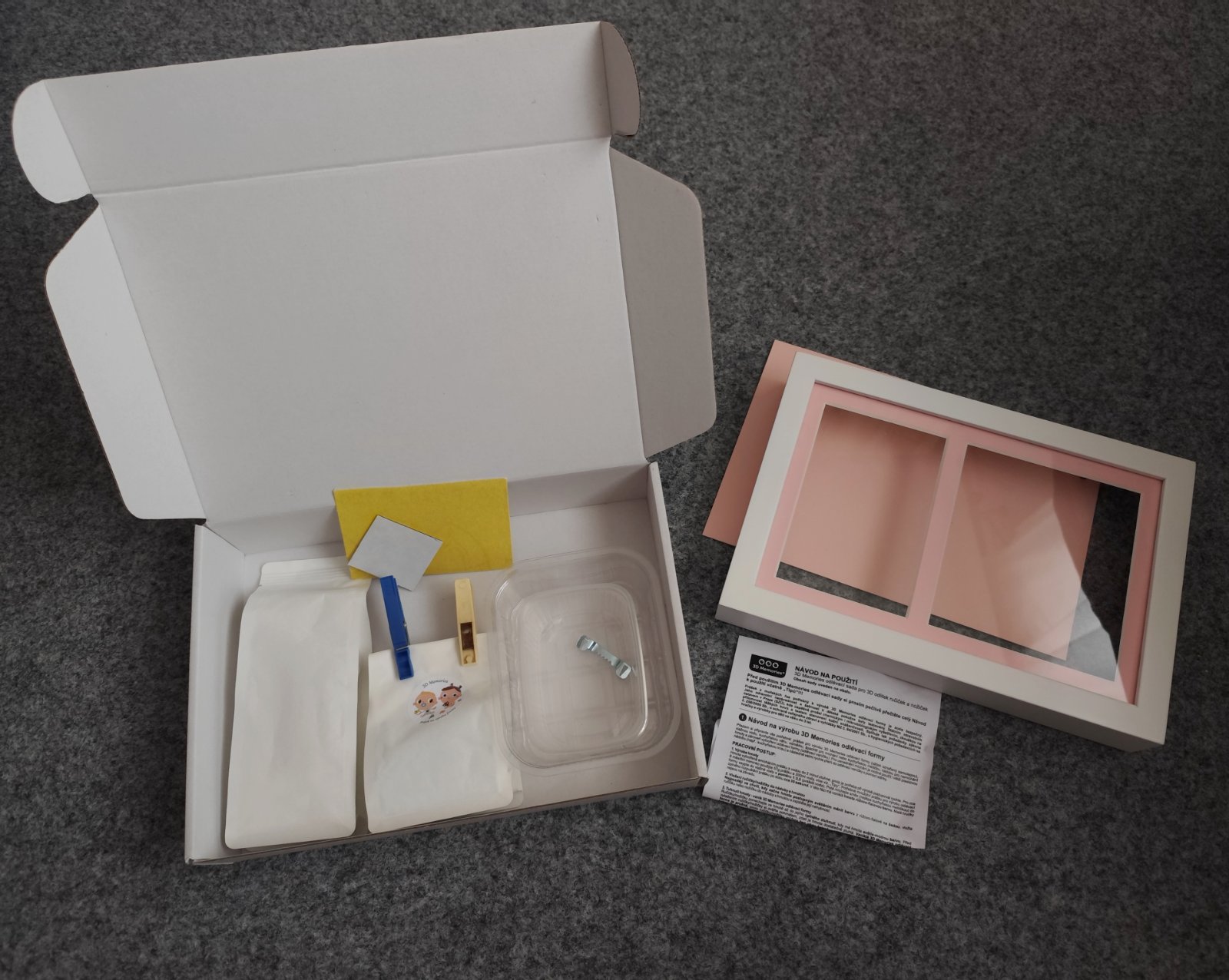 Predám skoro novú sadu na odliatky značky 3D-memories. Obsahuje hlboký rámik s ružovým pozadím, balenie sadry, balenie prášku na výrobu formy (čítaj info nižšie) 4 odlievacie vaničky ,háčik na zavesenie, obojstranný penový lepiaci štítok, brúsny papier a návod.