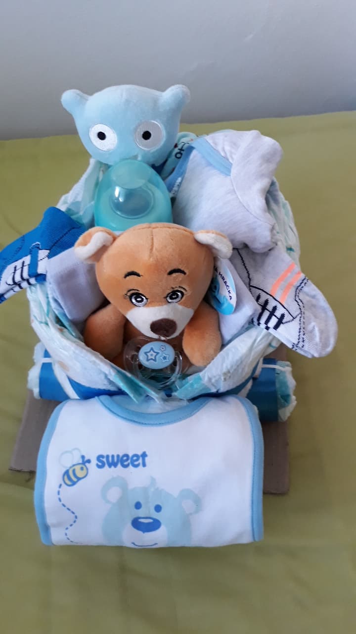 plienková torta: 20x plienka č.3, 2x látková plienka, 1x plast. krabička, 1x látkový podbradník, 1x macko, 1x fľaška, 2x ponožky, 1x bodíky č 74, 1x čiapočka, 1x cumlík