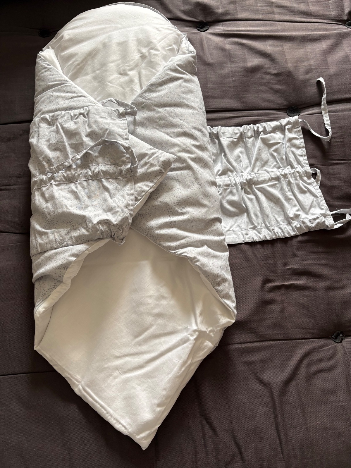 Predám úplne novú, nepoužitú zavinovačku značky Little Angel v šedej farbe s pevným chrbtom. Vrchná strana zavinovačky je vyrobená z bavlneného úpletu, je vyplnená mäkkým polyesterovým rúnom a v zadnej časti je spevnená.