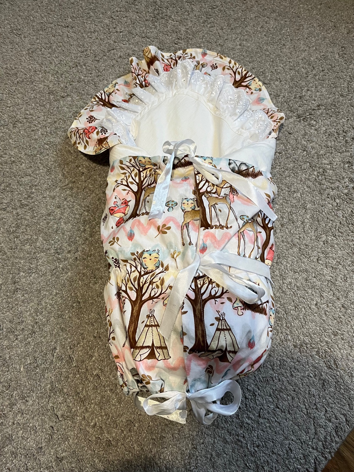 Nepoužitá len prepraná, mali sme letné bábätko a zavinovačka je teplá. Je na suchý zips - obojstranná, využitie aj ako prikrývka. Cena 8 e + poštovné