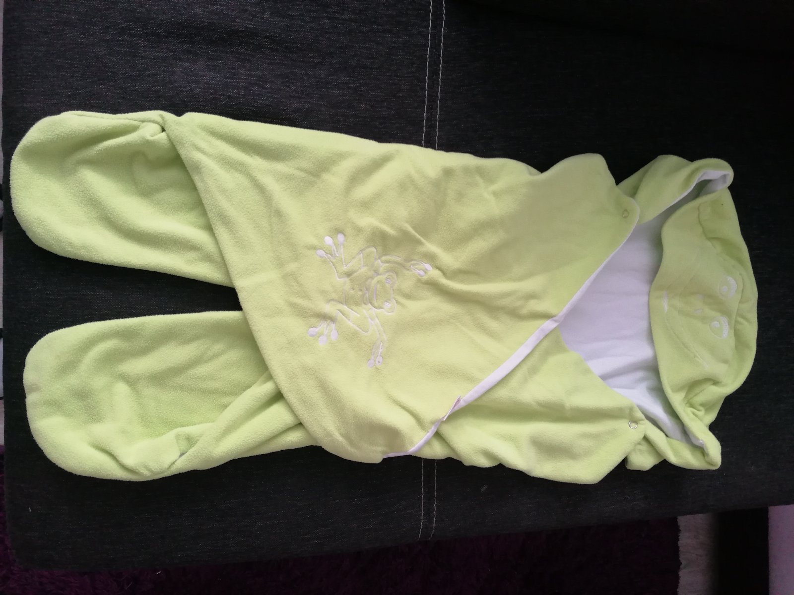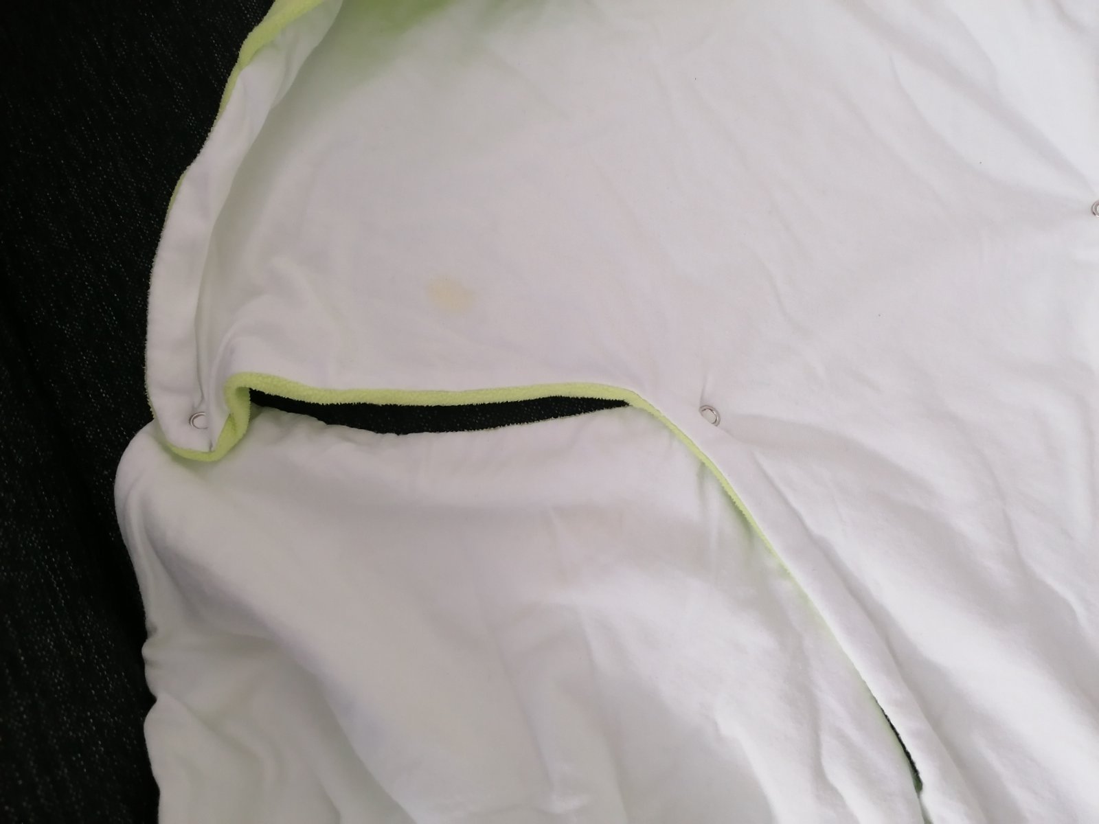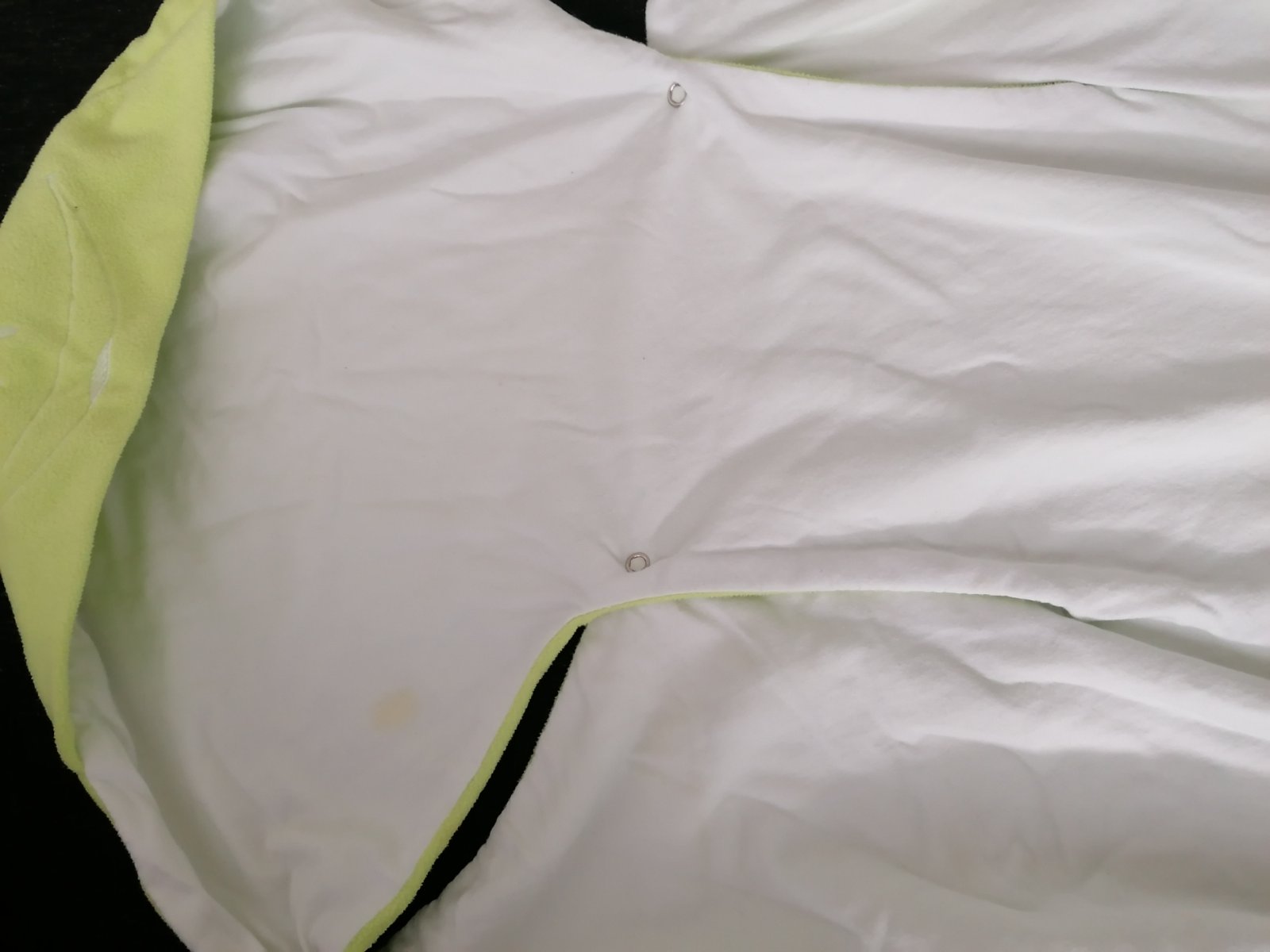 V dobrom stave bez dier ci zmolkov. Iba jeden mini fliačik na foto vedieť na bielej strane zvnútra. Myslím že keď sa to opere ešte raz tak to pôjde preč.