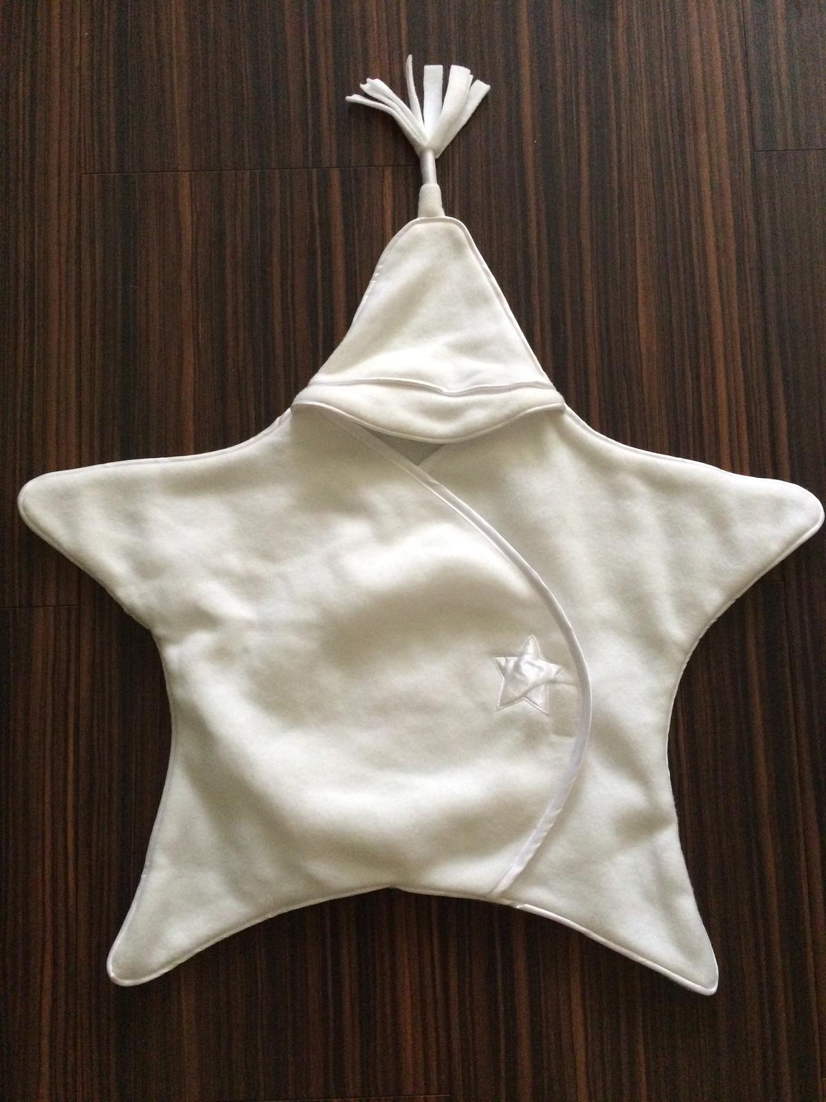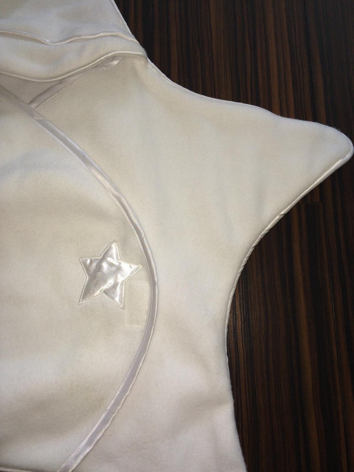 Milučká a teplučká zavinovacia deka pre najmenšie detičky v tvare hviezdičky, s možnosťou zakrytia hlavičky vďaka kapucni, na ktorej je našitý brmbolec. Olemovaná efektnou bielou trochu lesklou stužkou. Farba: Biela. Značka: Cuteypie. Zapínanie na suchý zips, pri ktorom je našitá malá hviezdička z tej istej látky ako lem. Materiál: 100% polyester. Rozmery: od špičky čiapočky až po spodok (pudlo) 61 cm, rozteč horných cípov, do ktorých sa môžu dať ručičky 74 cm, v najužšej časti v okolí pása 45 cm.