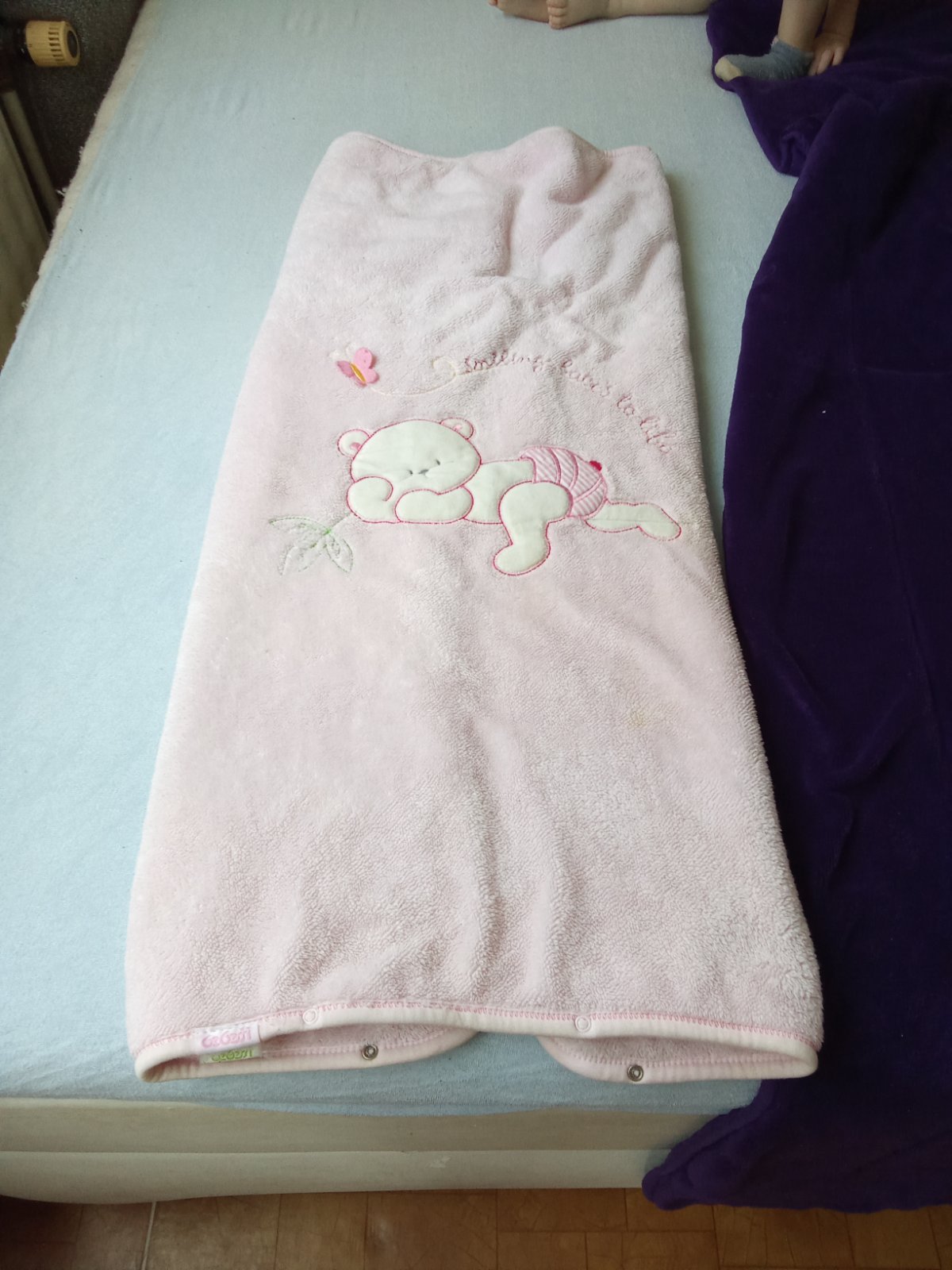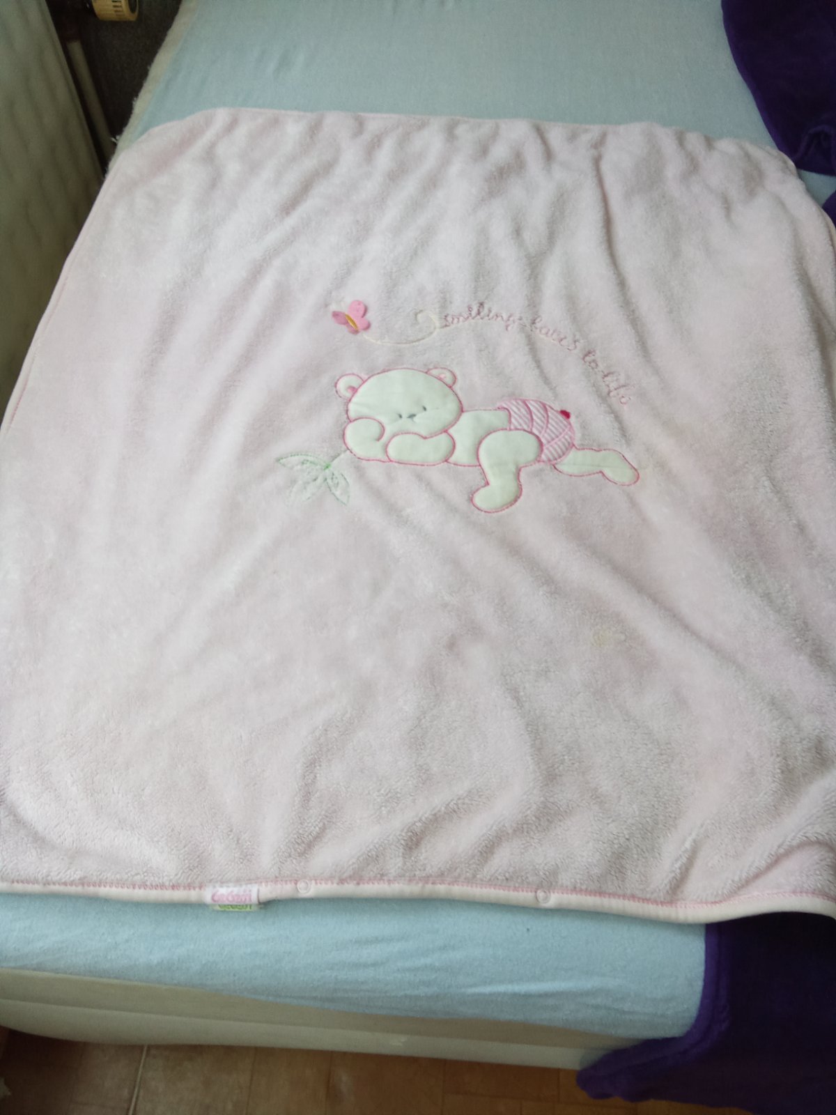 Predám detskú deku značky Little Eye v peknej štruktúre v kombinácii bledoružová/biela. Rozmer je 80x80 cm, decka má 1 malú vadu - nevyprateľný fliačik od kolesa kočíka.