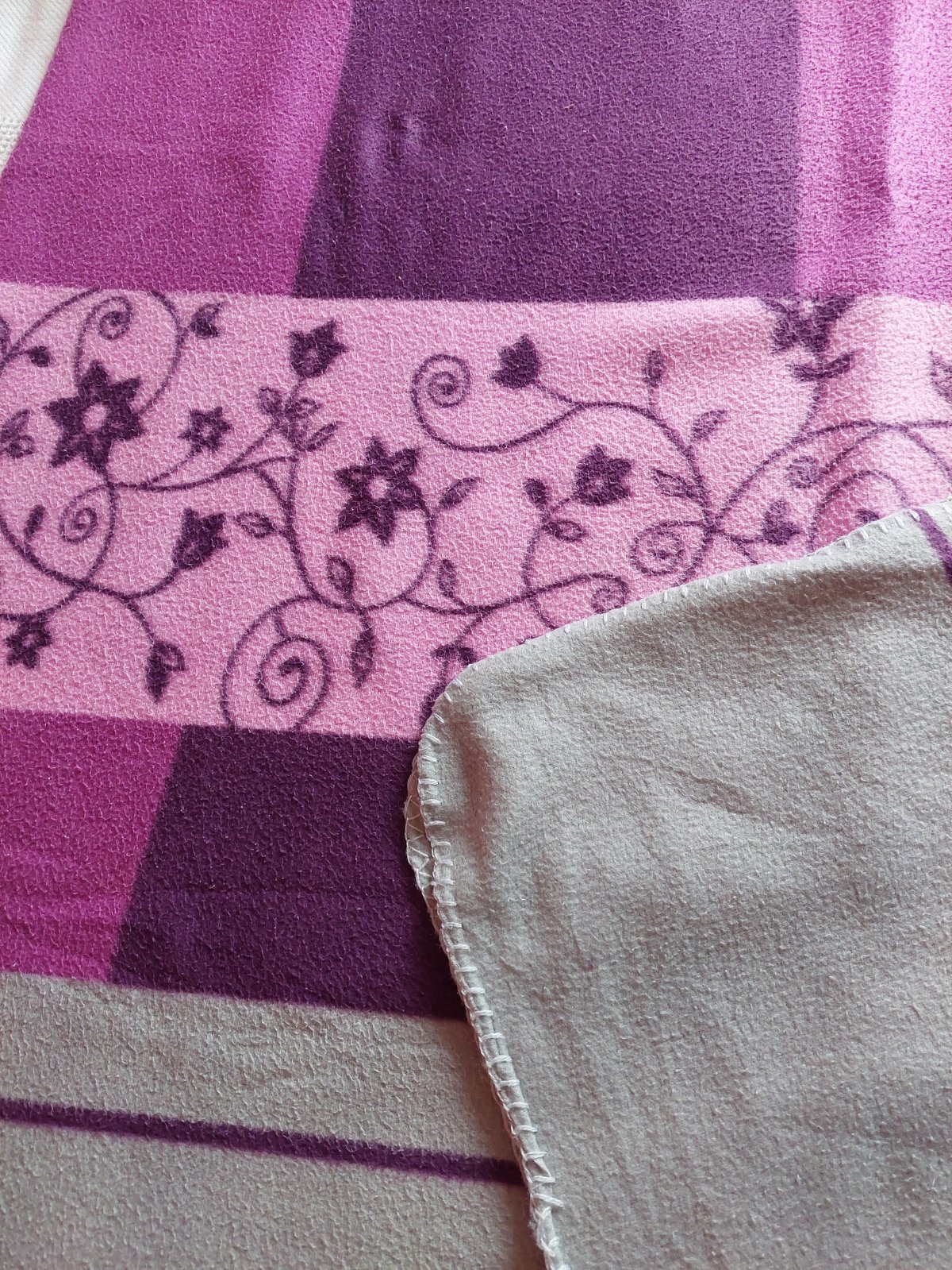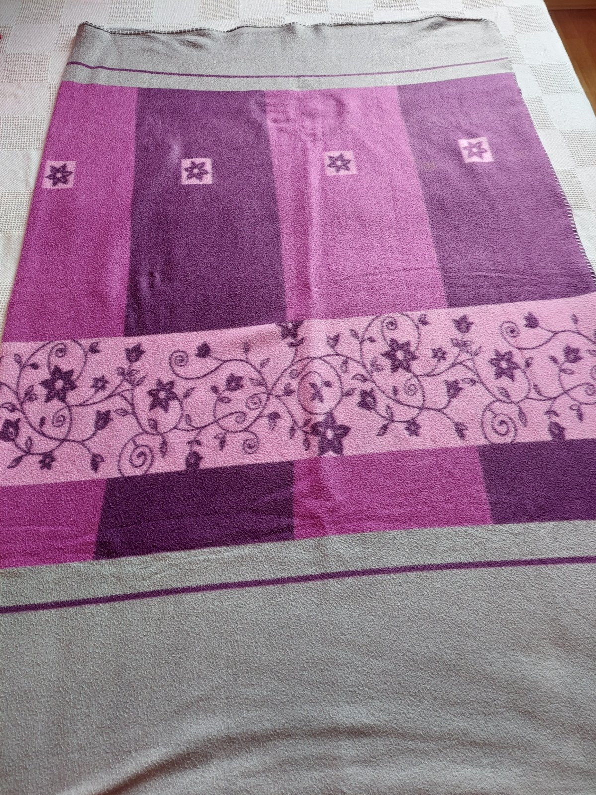 Predam fialovu deku so vzorom, vid obr. Rozmer: 192x148mm cca. Jedina vada, drobne dierky, vid obr., nemaju vplyv na fukcnost. Nie je ich takmer vobec vidno.
