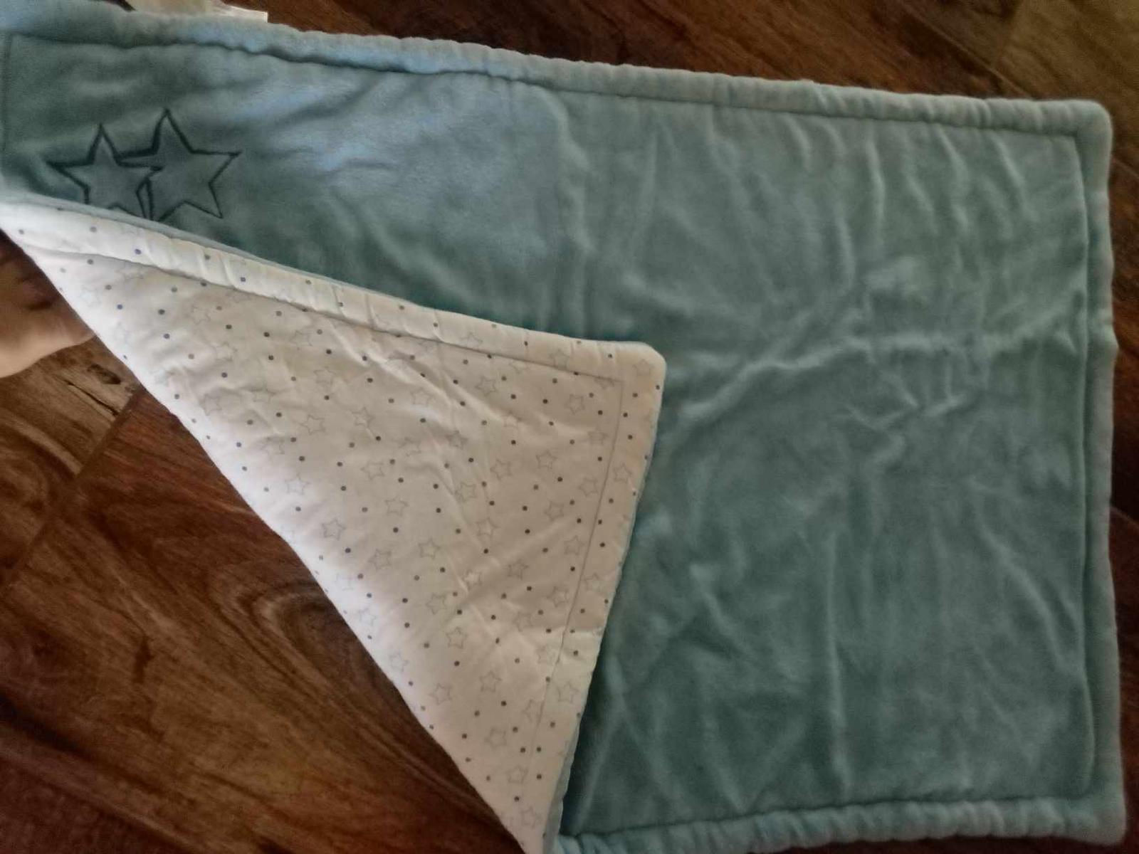 Krasna deka Marks and Spencer. Pouzivana pri syncekovi. Kupila som si ju v UK. 2 vzory: vrch strikovany bielo- slabomodry a druha strana cela slabomodra. 100% bavlna.