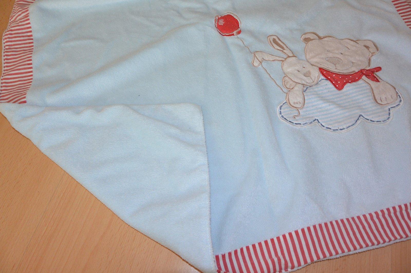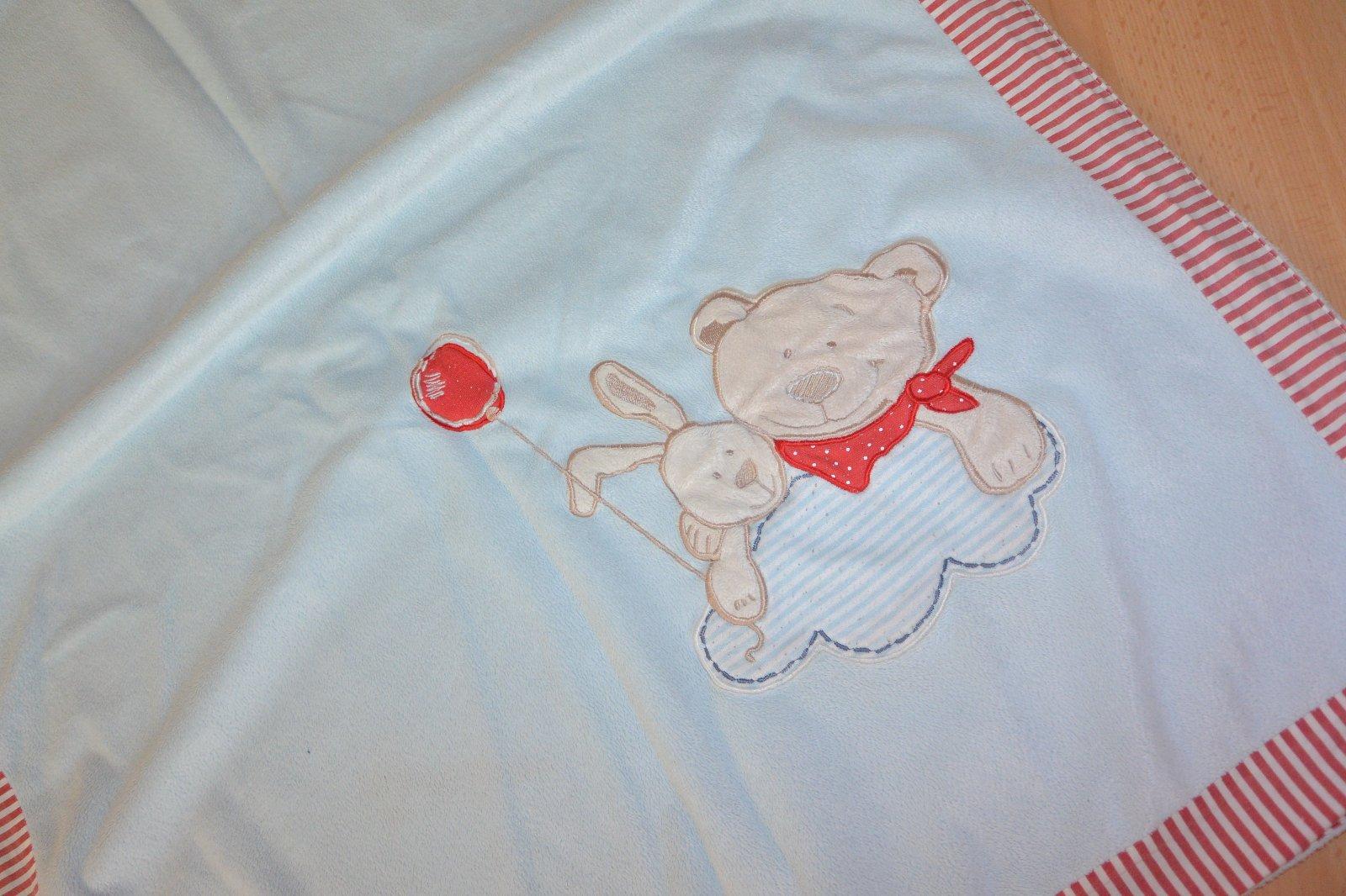 Predam pouzivanu, ale kvalitnu a stale peknu deku v rozmere 67 x 94 cm. Bledomodra, obojstranna, flis, bavlnena nasivka medvedika. Pasikavy bielo-cerveny lem po obvode.