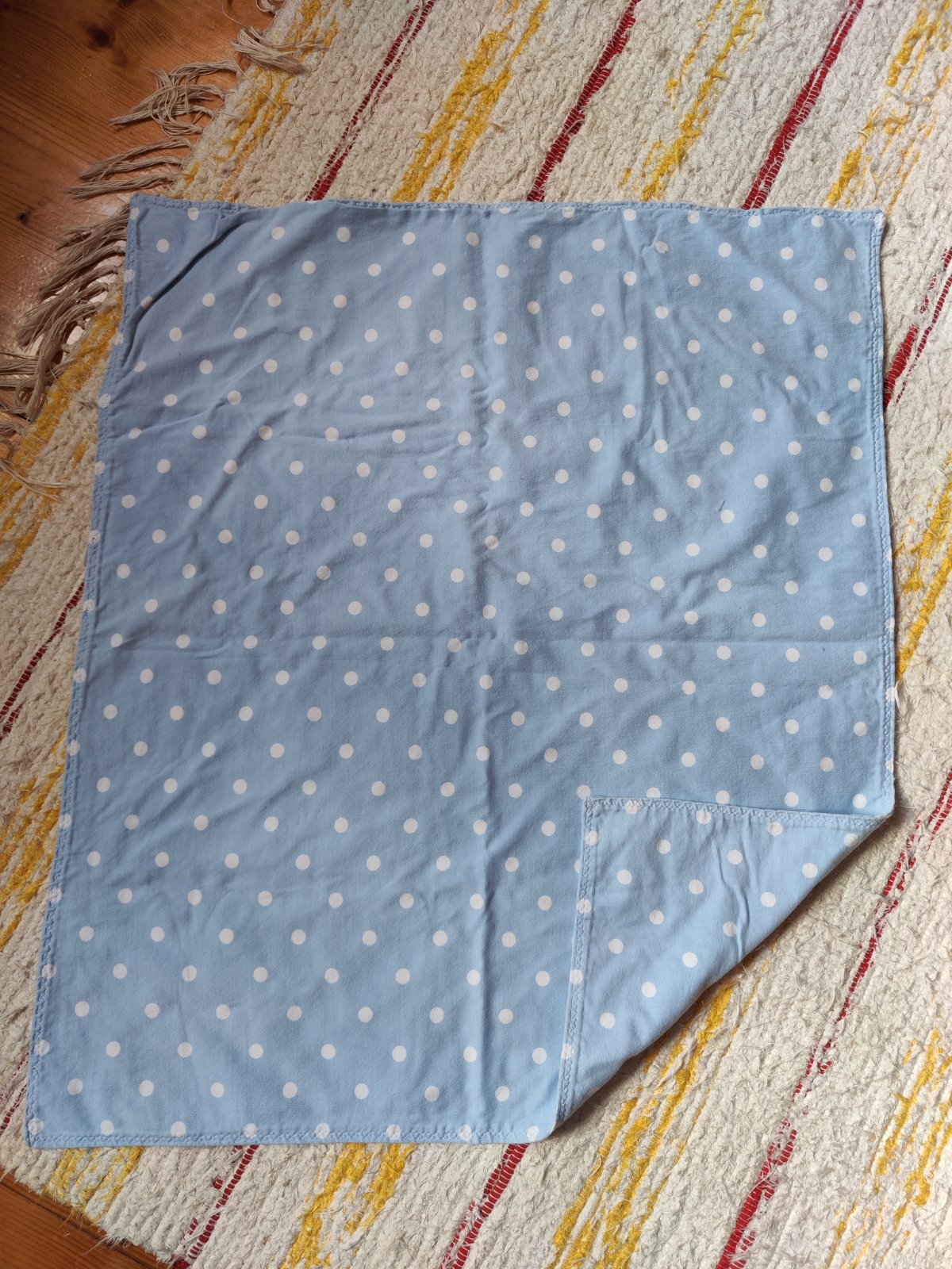 - handmade bledo modrú deku s bielymi bodkami, je to zmes bavlny a viskózy, rozmer cca 53x63cm