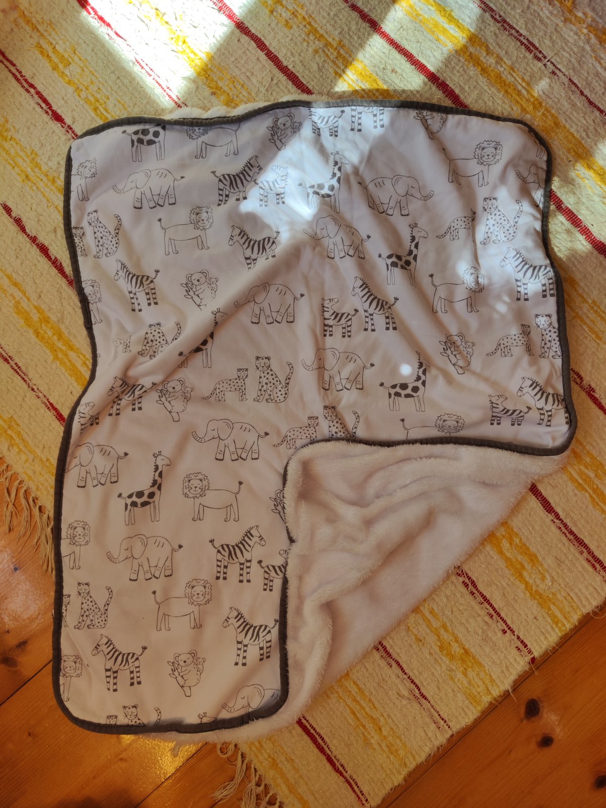 - zateplenú bielu deku s motívom zvierat, z jednej strany kožušinka z druhej bavlna, F&F, rozmer 80x100