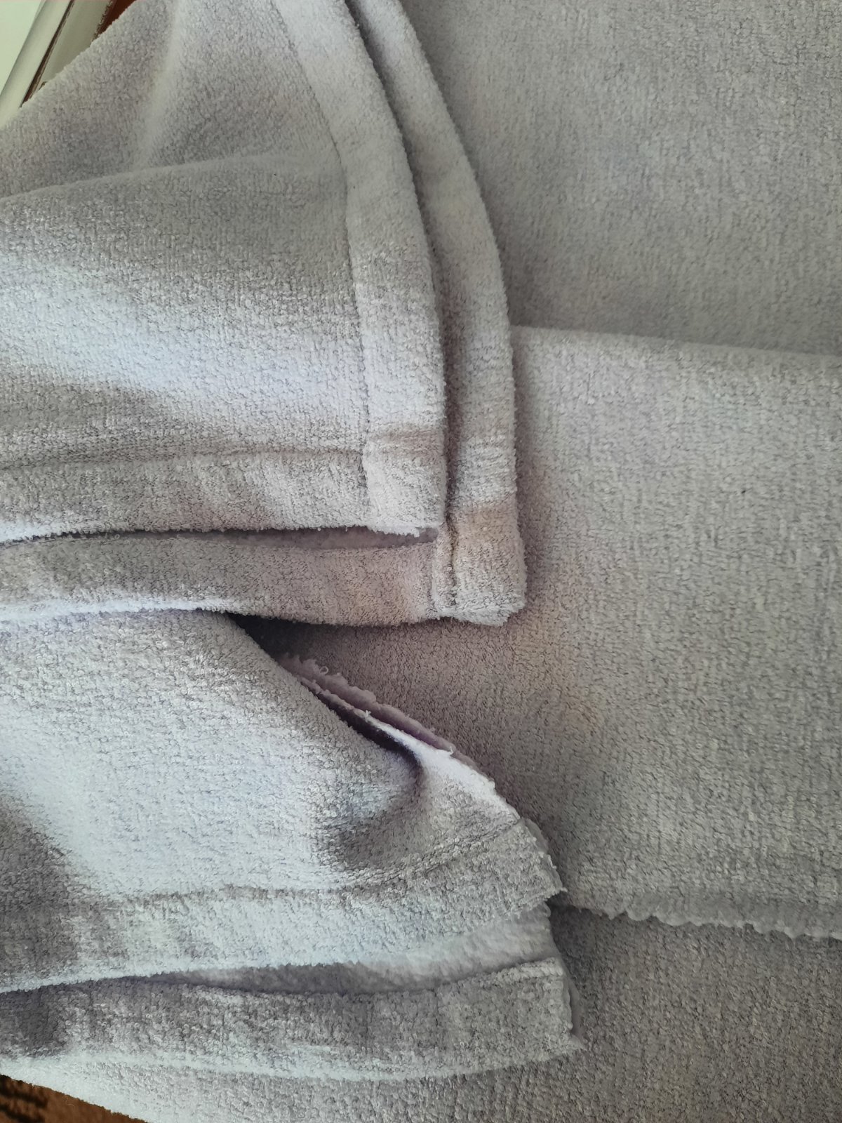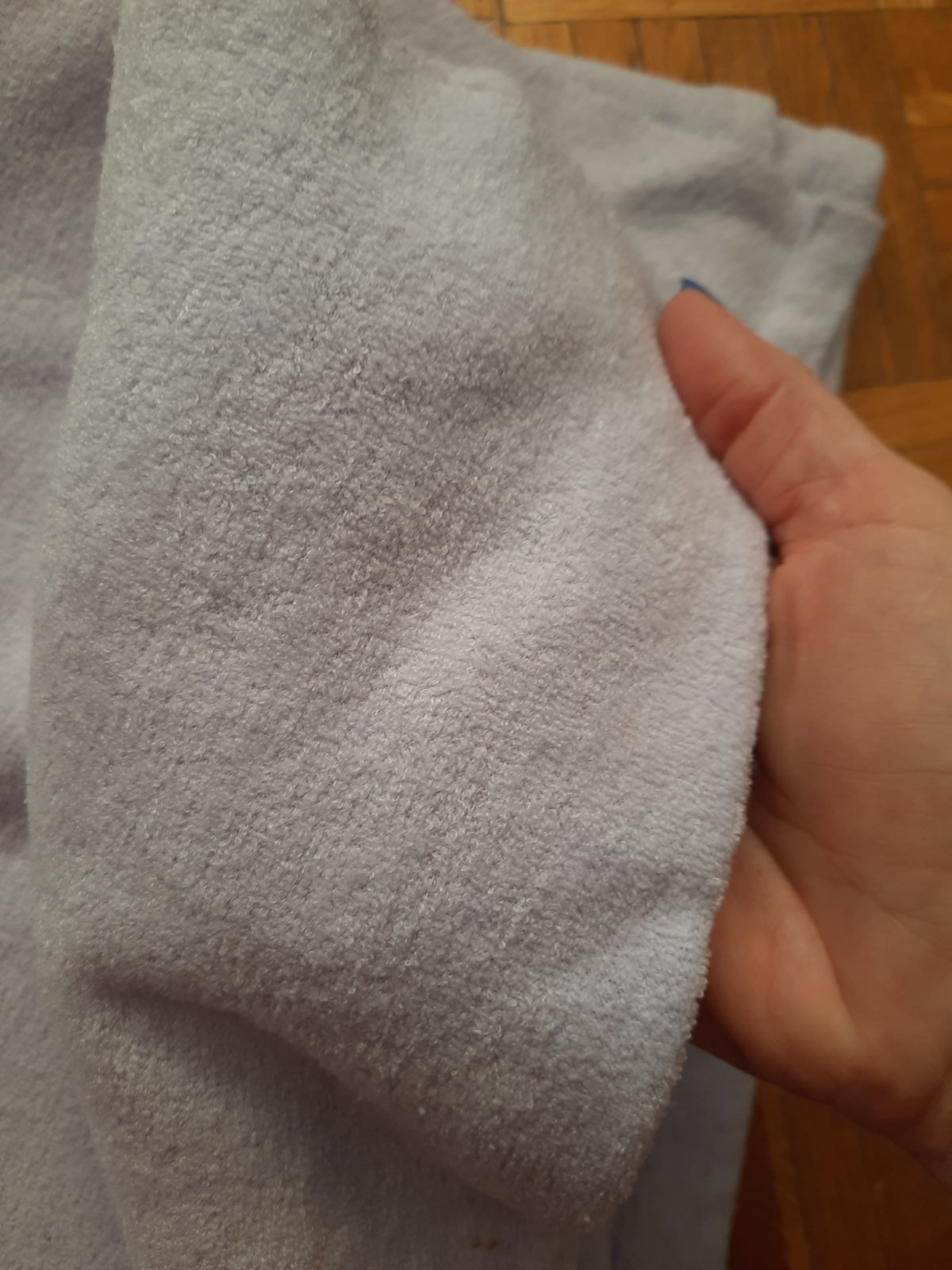 Látka -buklé (príjemná, mäkkučká, nekrčivá). Mám 2 kusy. Jedna je o trošku menšia ako druhá. Farba je jemná fialová-orgovánová.