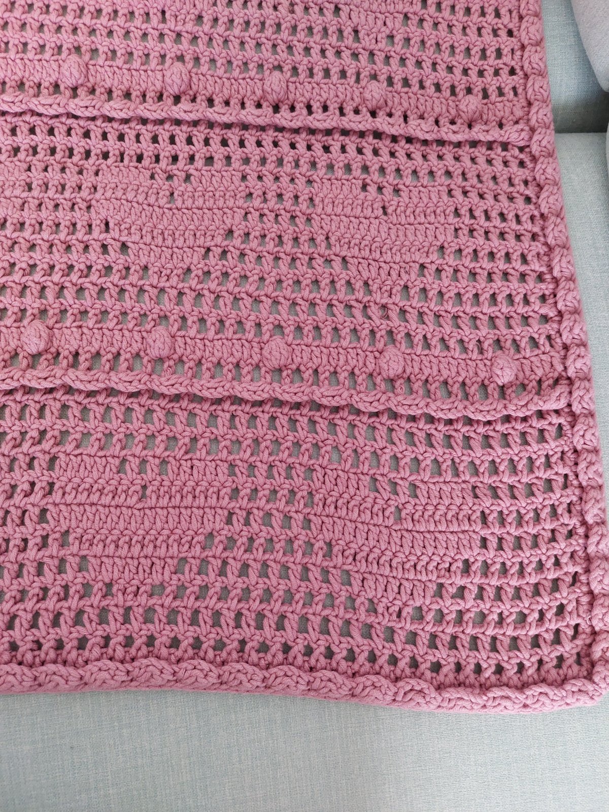 Ručne robena deka, pouzita raz, robila ju teta,ale nemám rada ruzovu. Je to taka ruzovo-fialova, tým,že ma vacsie dierky nie úplne do velkej zimy. Pekna so srdieckami a gulickami.