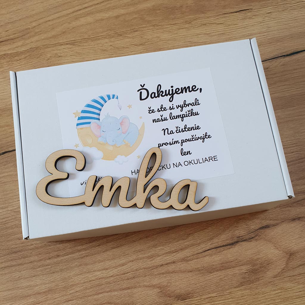 Meno dieťatka napíšte do políčka pri výrobku. Ak si prajete pridať venovanie aj na drevený podstavec lampičky, tak stačí označiť možnosť (Gravírovanie na podstavec + 5 €) a napísať želaný text. Po prijatí objednávky Vám pošleme na email meno aj Váš text vo viacerých typoch písma na výber.