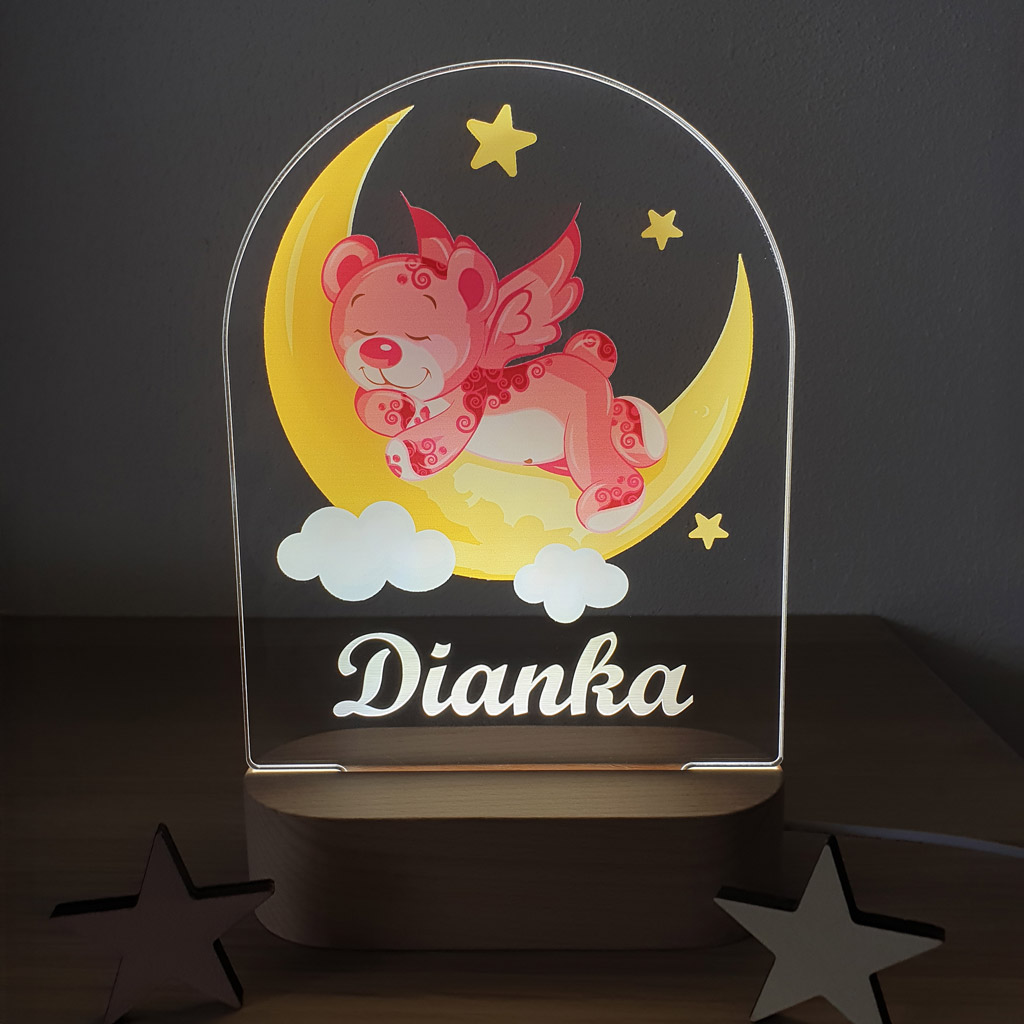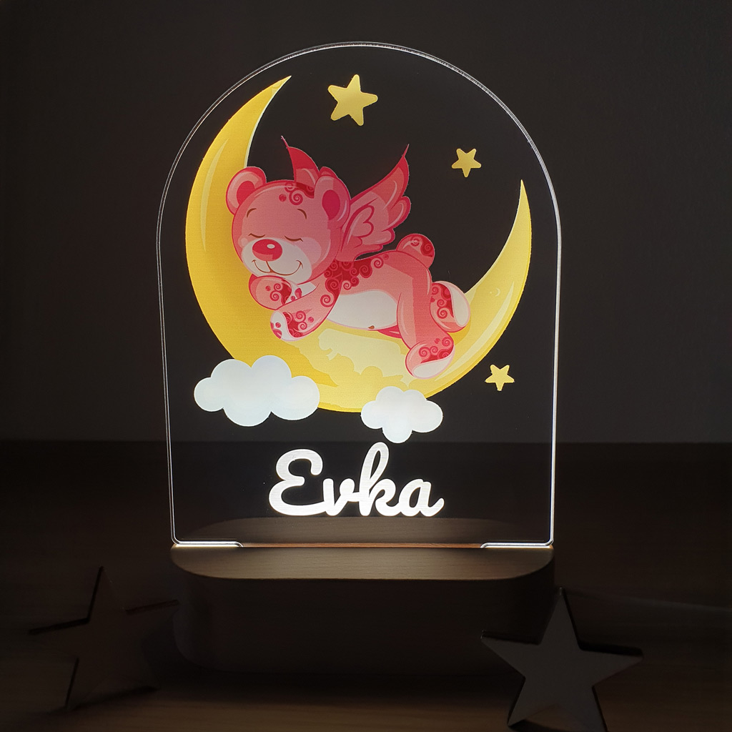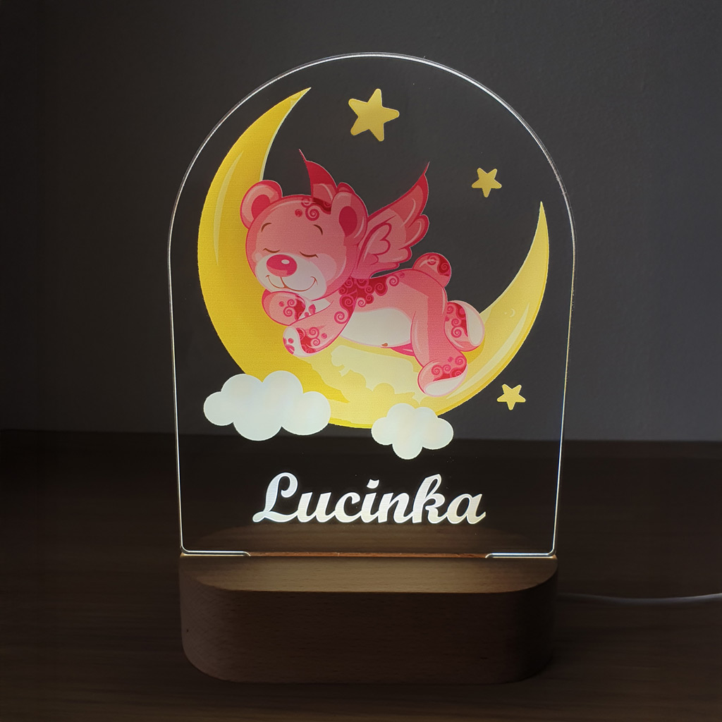 LED nočná lampa s vlastným menom dieťatka a motívom ružového macka rozžiari nielen detskú izbičku, ale aj očká detí. Je to tiež ideálny darček k narodeniu dieťatka, na krstiny, narodeniny, či meniny.