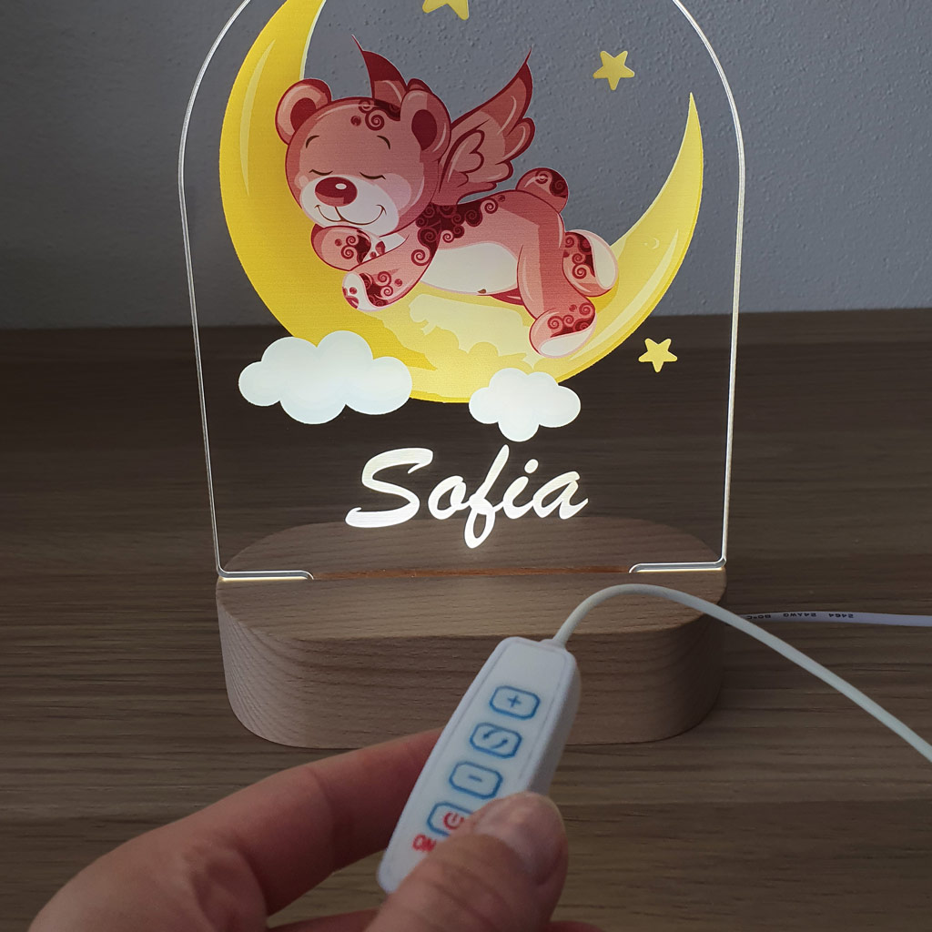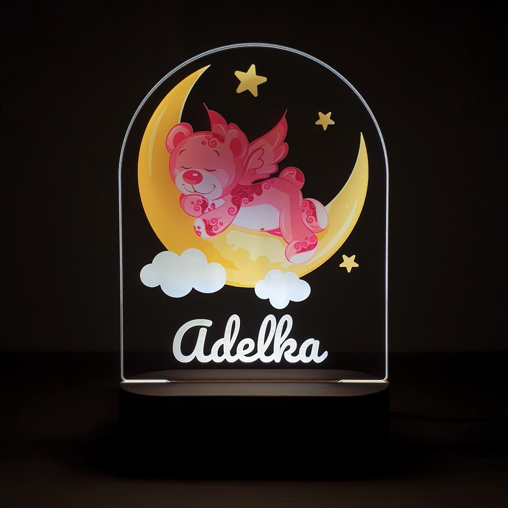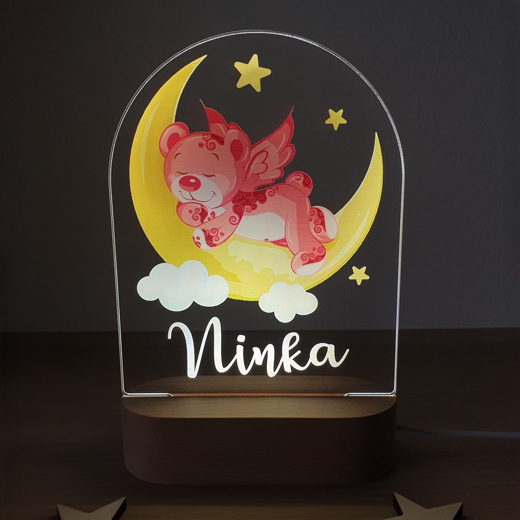 LED nočná lampa s vlastným menom dieťatka a motívom ružového macka rozžiari nielen detskú izbičku, ale aj očká detí. Je to tiež ideálny darček k narodeniu dieťatka, na krstiny, narodeniny, či meniny.