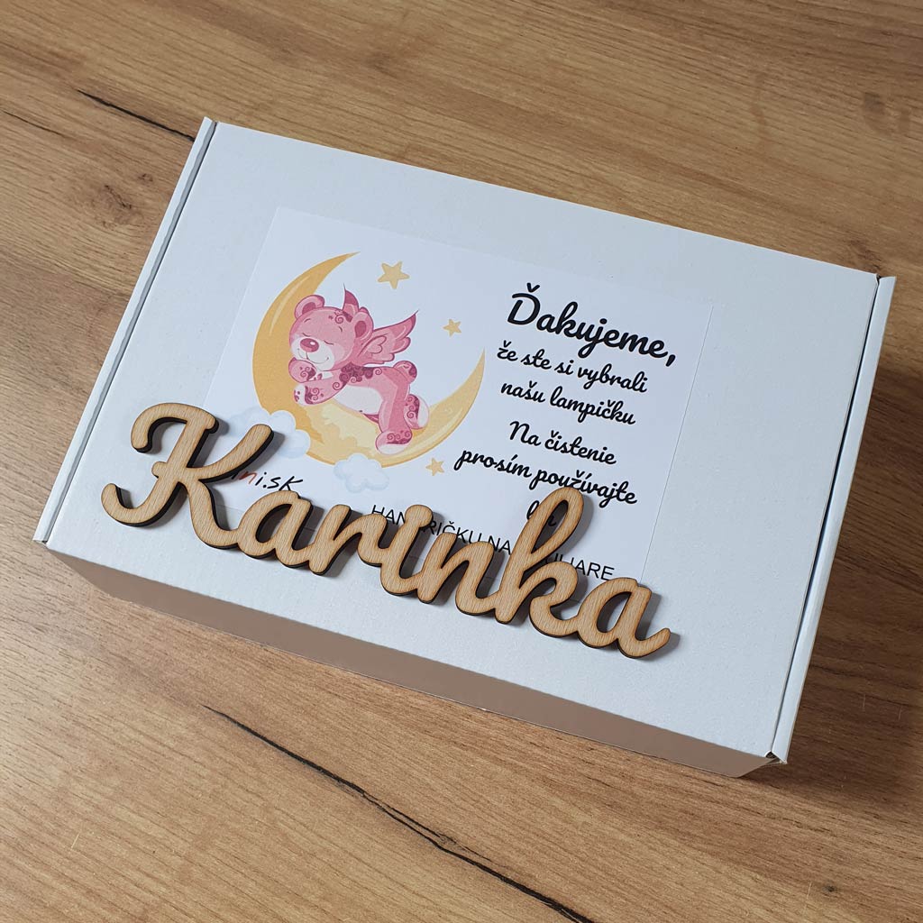 Meno dieťatka napíšte do políčka pri výrobku. Ak si prajete pridať venovanie aj na drevený podstavec lampičky, tak stačí označiť možnosť (Gravírovanie na podstavec + 5 €) a napísať želaný text. Po prijatí objednávky Vám pošleme na email meno aj Váš text vo viacerých typoch písma na výber.