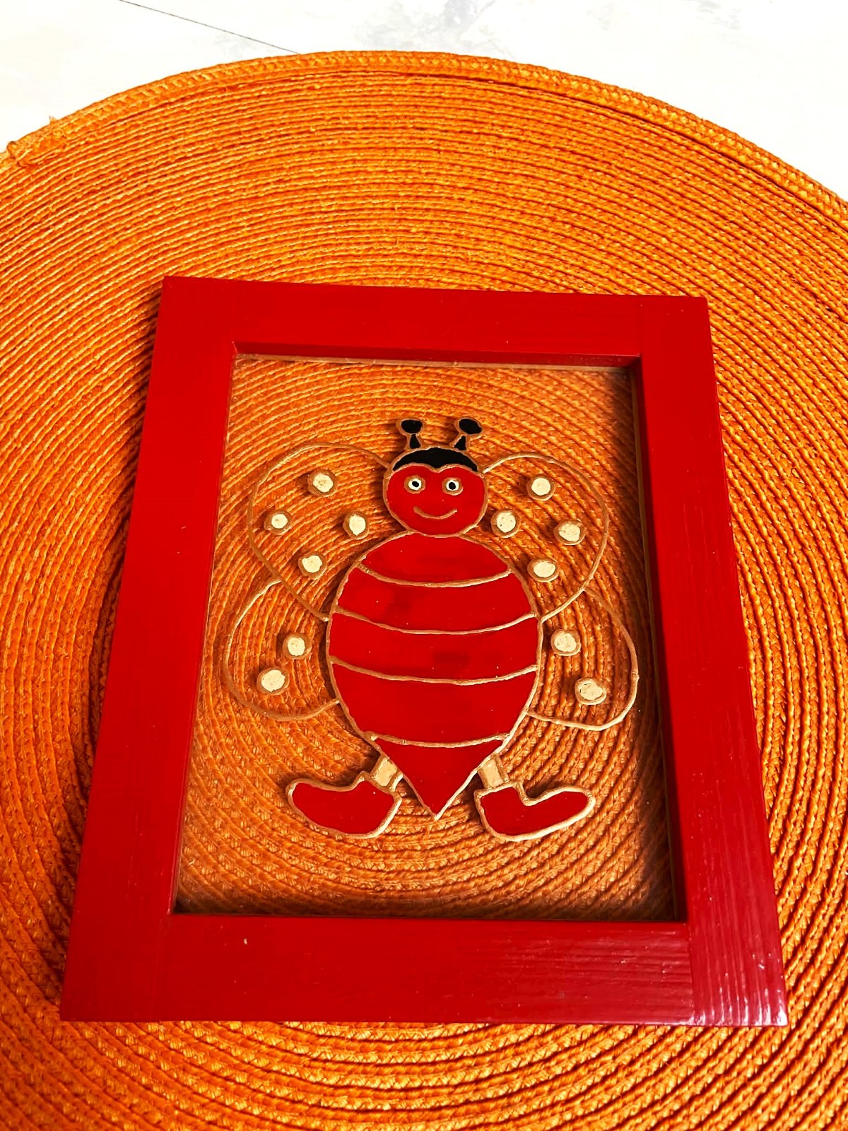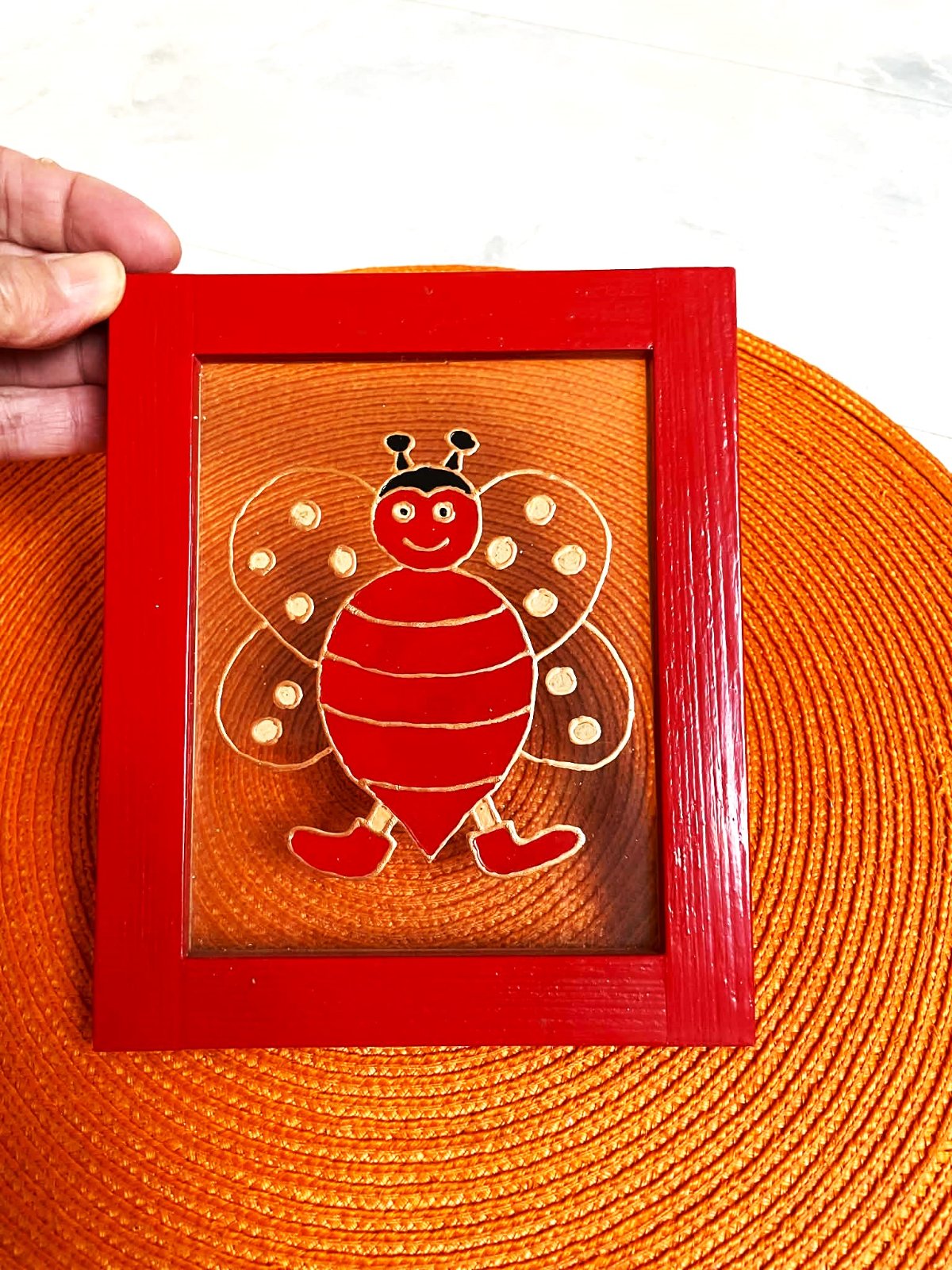 krásny na skle maľovaný obrázok v červenom drevenom rámiku,málo používaný,kúpený na dňoch umeleckých remesiel - ručná práca,top stav,krásne oživí interiér detskej izby,14,5 x 17,5 cm