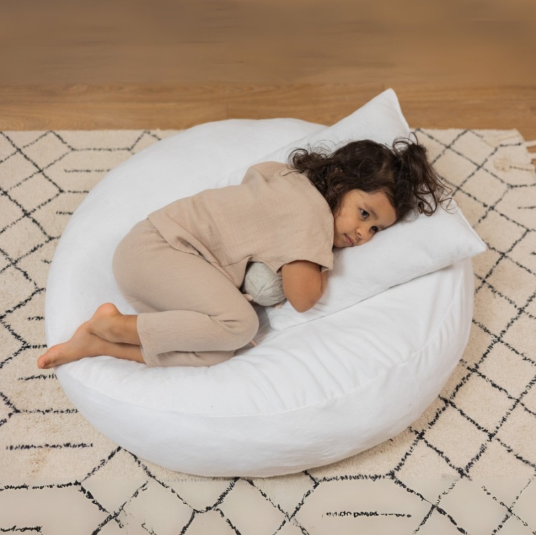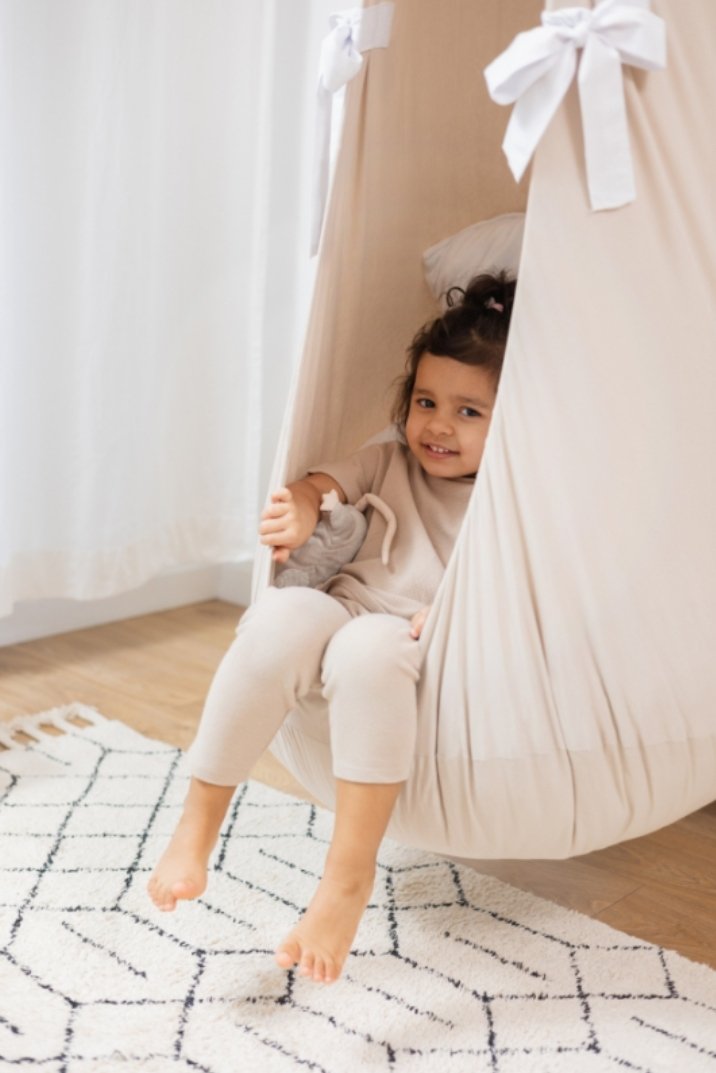 Materiál hojdačky: 100 % prírodná, nefarbená bavlna.Farba: Svetlý krémový odtieň meringue s kontrastnými bielymi mašľami.Vankúš: Hladký, mäkký s antialergickou silikónovou výplňou, priemer 90 cm.