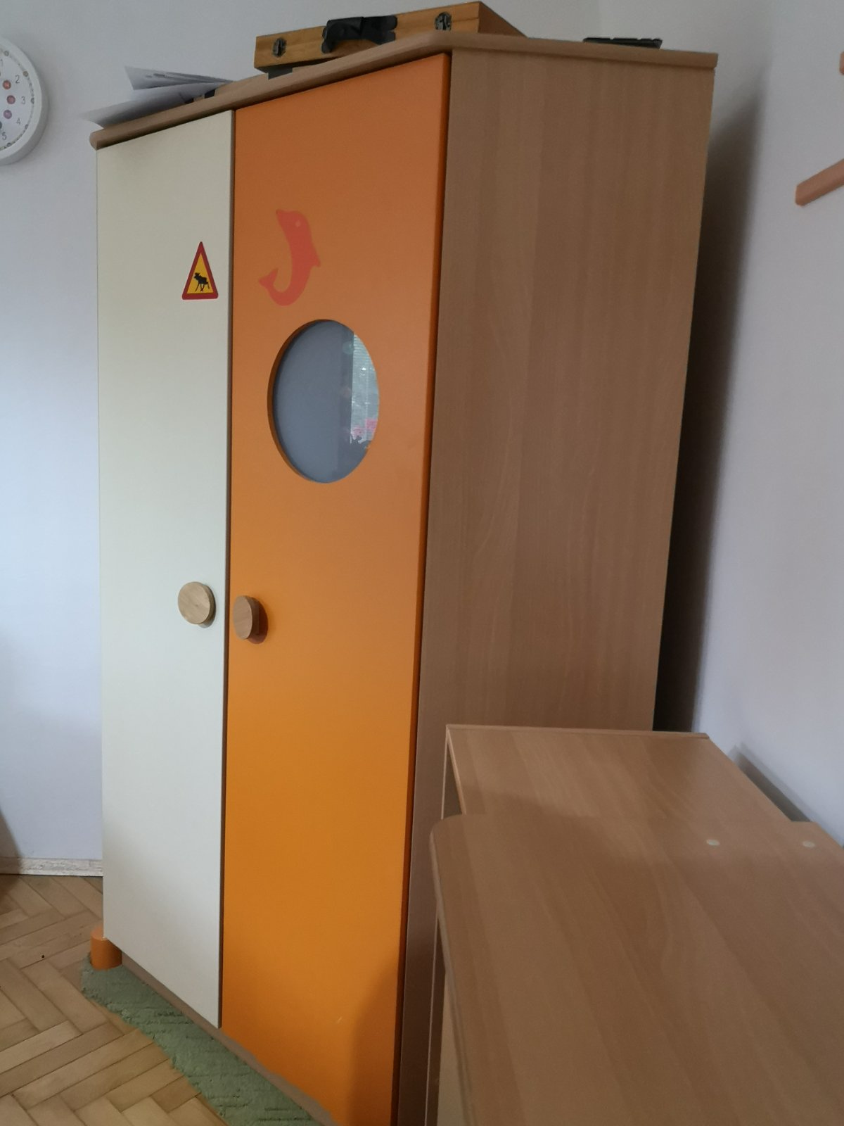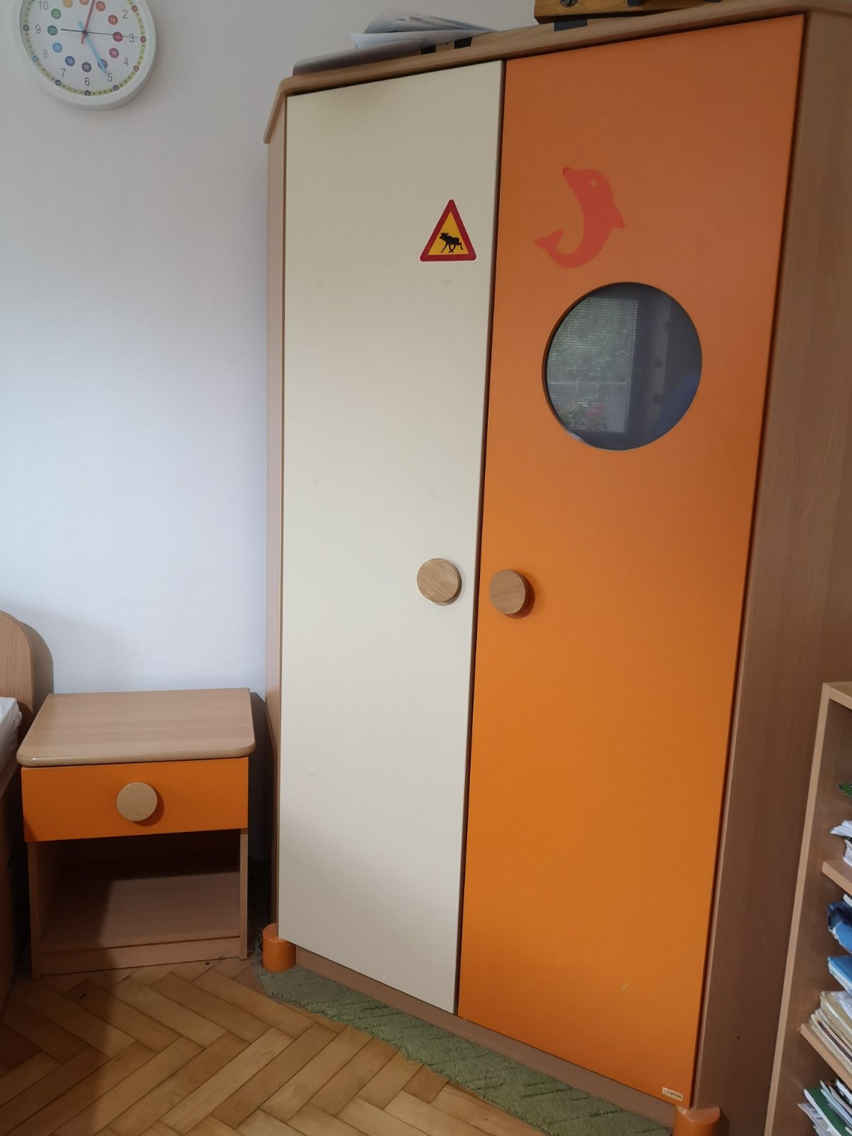 Predám detskú izbu značky FAKTUM. séria KOLIBRI oranžová v kombinácii s country bukom. Je to kvalitný výrobok, pevný, kupovaný ako nový. Skladá sa z nasledovných častí: