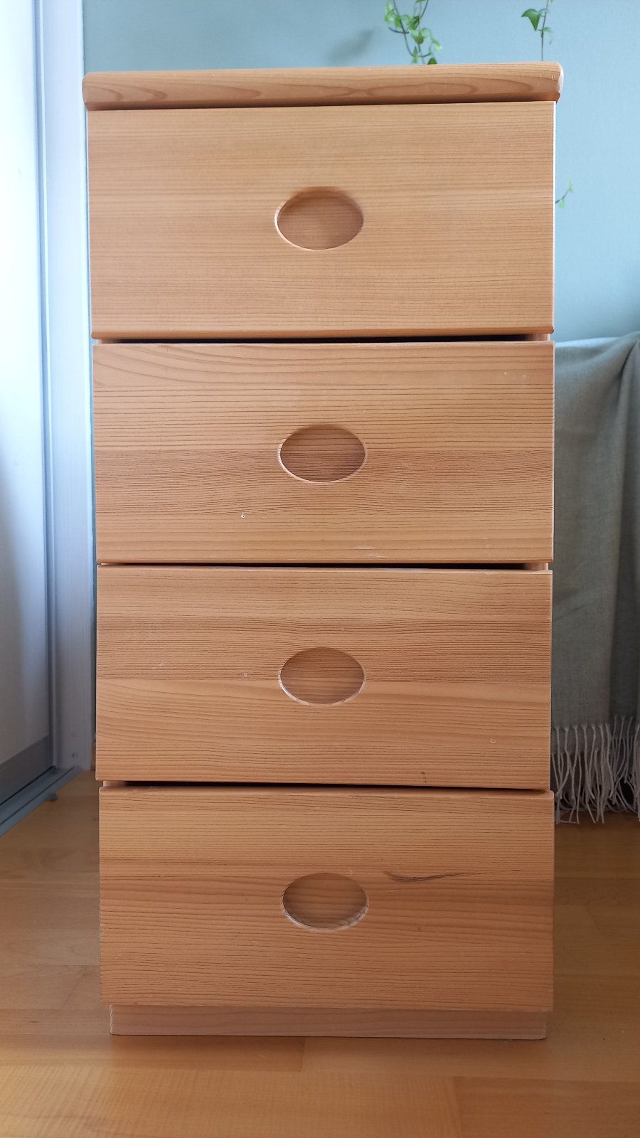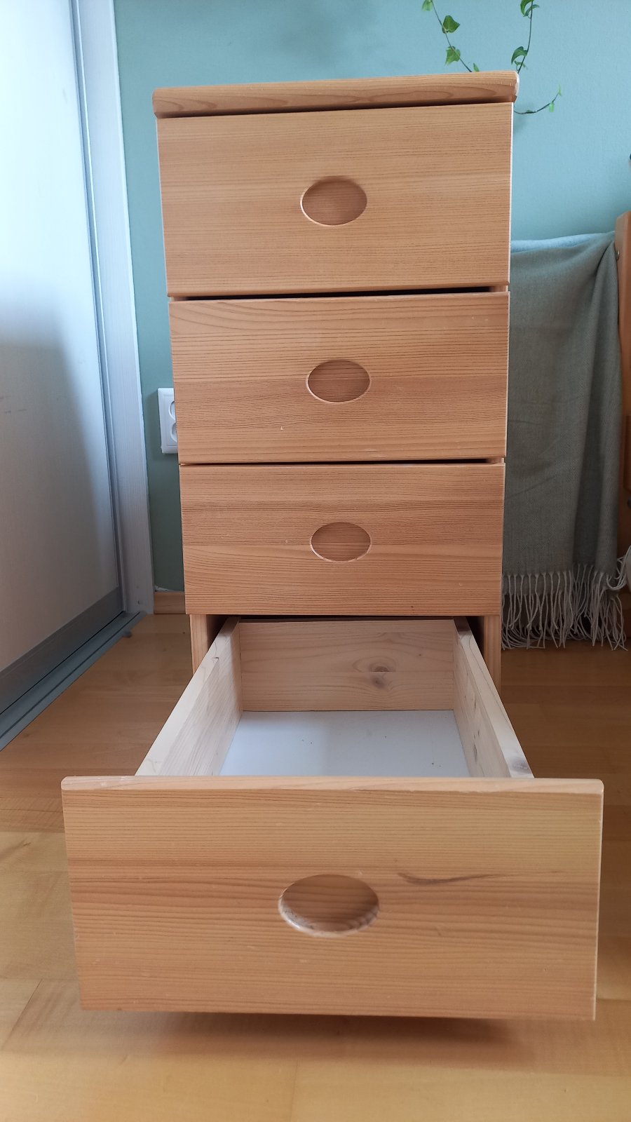 Predám skrinku so zásuvkami z masívneho dreva od slovenského výrobcu Domestav, zo série nábytku do detskej izby. Stav viď foto. Používaná, cena prispôsobená. Osobný odber v Pezinku, treba zniesť zo 4. poschodia. (V ponuke aj 2-dverová policová skriňa z rovnakej série.)