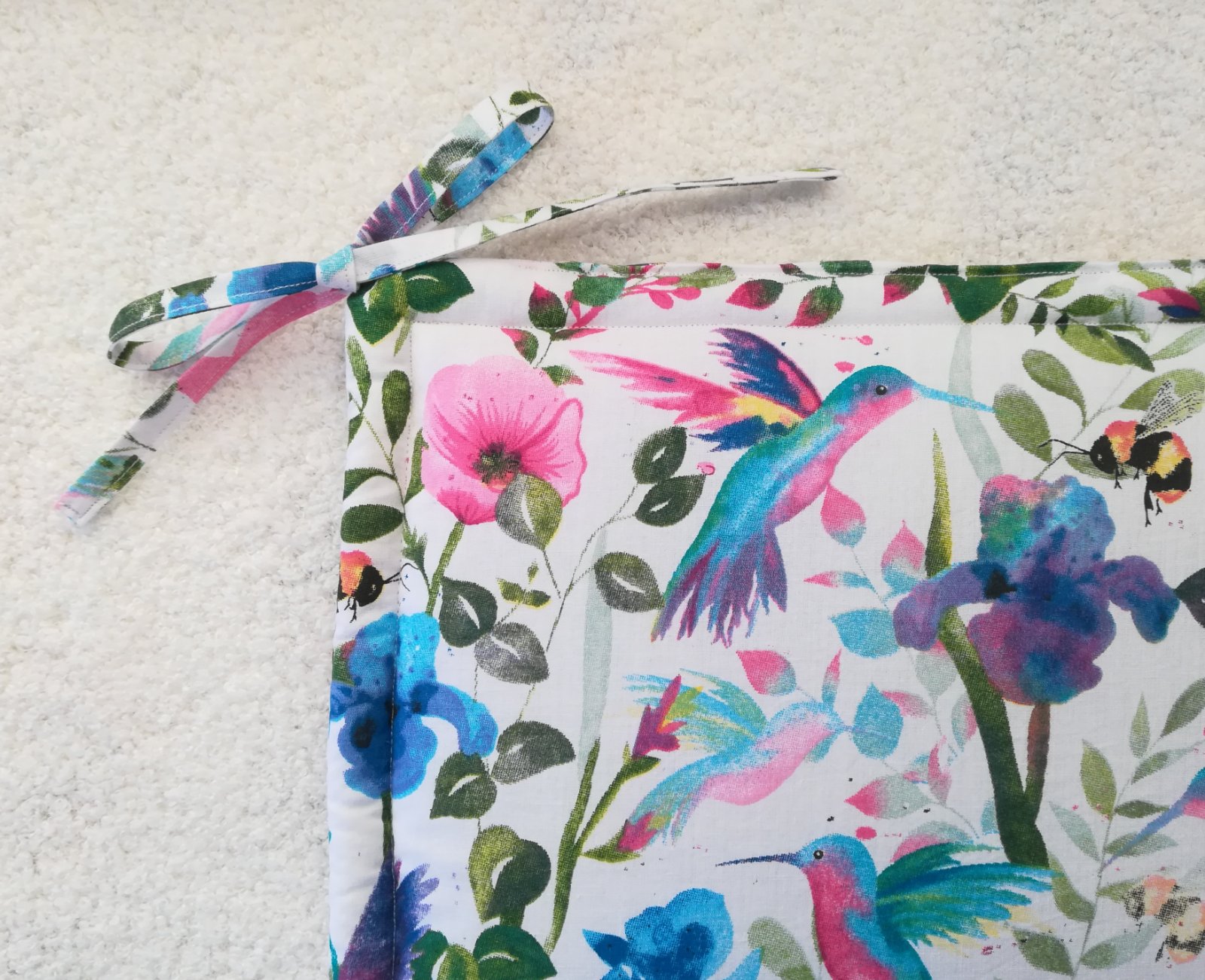 Podsedák/ vankúšik/ poduška na detskú stoličku do školy, škôlky alebo len tak na doma s bočným viazaním, kolibríky a včely na bielom