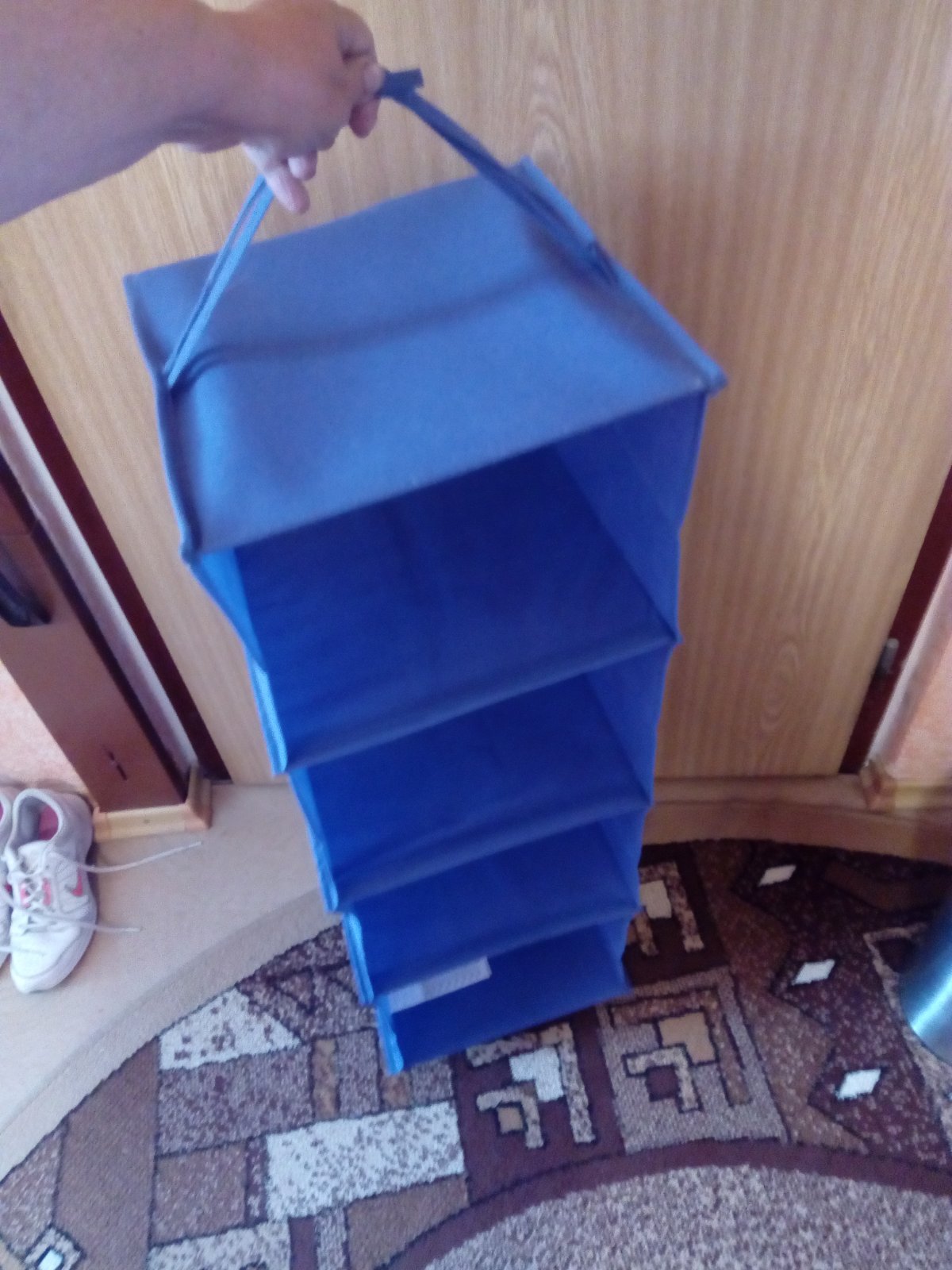Skladací závesný organizér ktorý má 4 okienka o rozmere 30 x 30 cm. Bol kupovaný v IKEA málo používaný bez poškodenia. Poličky nie sú prehnuté pekne držia.