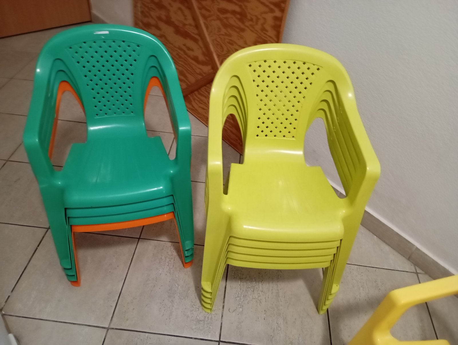 Plastové stoličky vo farbe oranžová, svetlo a tmavozelena