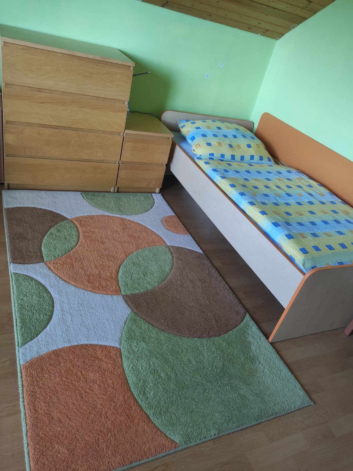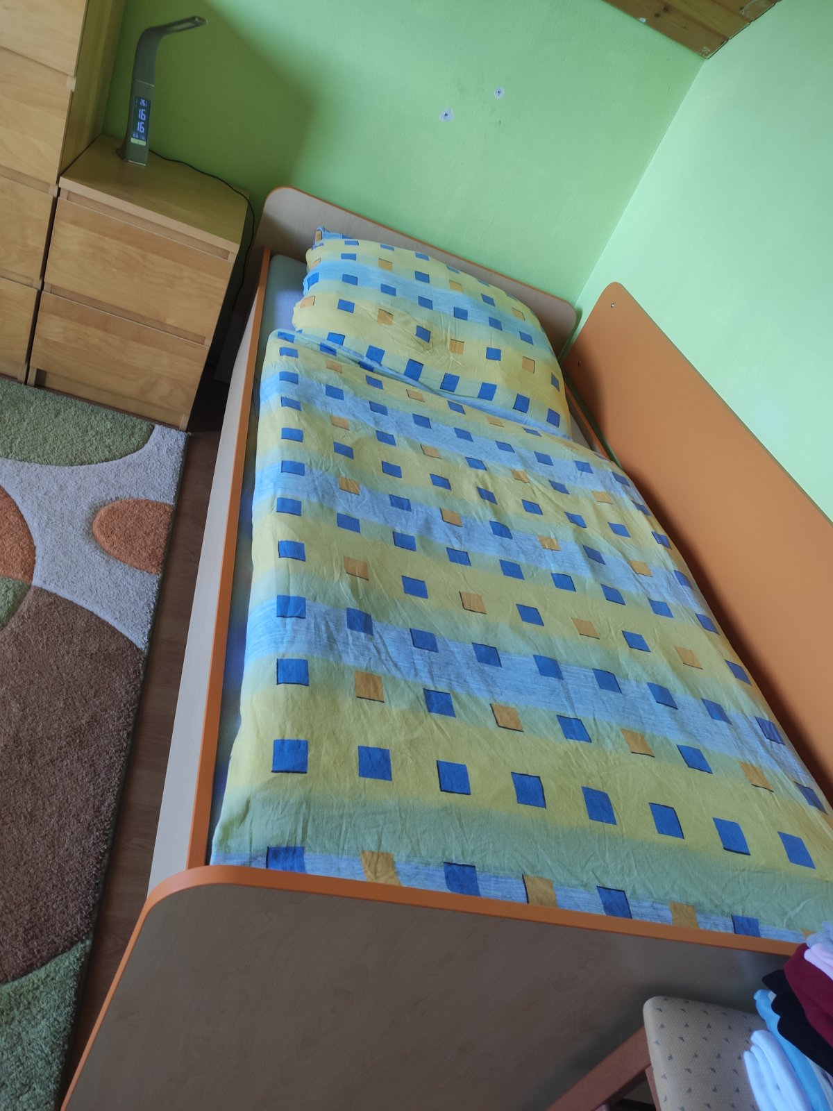 Posteľ spolu so zástenou rovnakého materiálu ako je posteľ, farba: javor + oranžová (bez roštu a matraca) za 45€. V prípade záujmu mám aj zábranu proti padnutiu z postele + 5€.