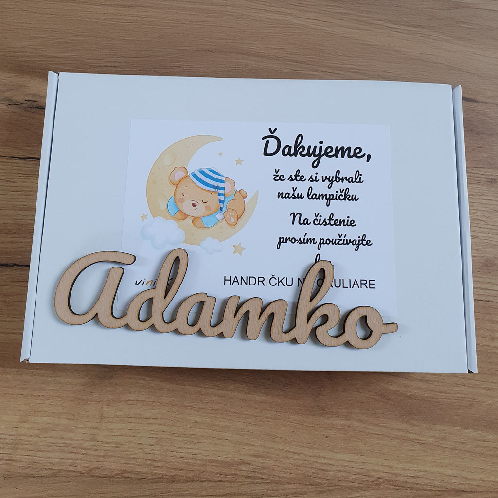 Meno dieťatka napíšte do políčka pri výrobku. Ak si prajete pridať venovanie aj na drevený podstavec lampičky, tak stačí označiť možnosť (Gravírovanie na podstavec + 5 €) a napísať želaný text. Po prijatí objednávky Vám pošleme na email meno aj Váš text vo viacerých typoch písma na výber.