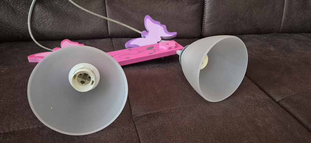 funkčný luster, len už deti vyrástli, je krásny ružovo fialový s motýlikmi, nepoškodené tienidlá v matnej bielej, drevené motýliky a ružová drevená predelovacia časť, v perfektnom stave