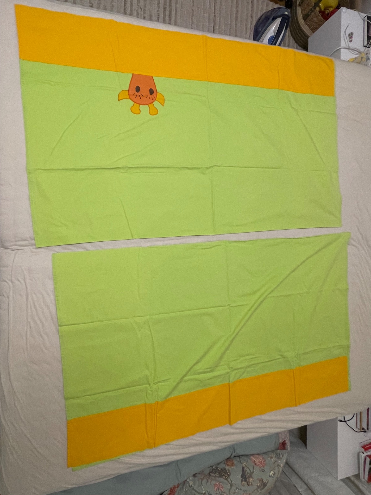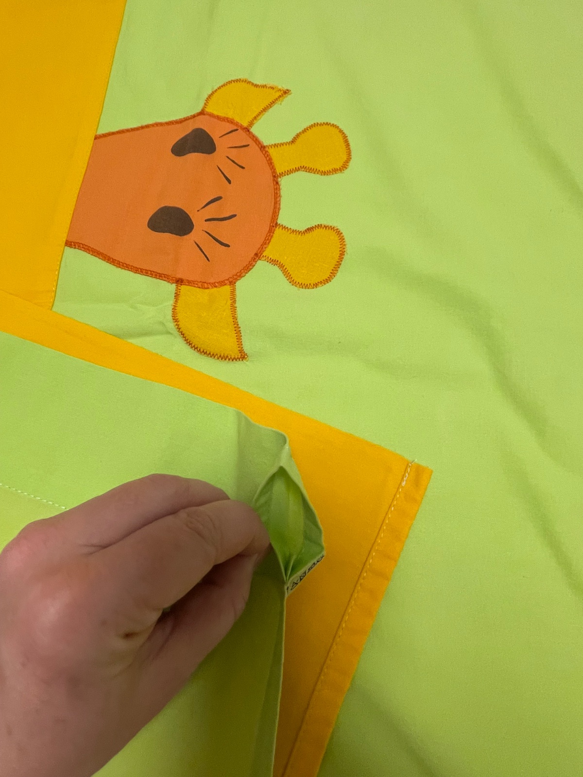 * 2x Zaves,168x137 cm, zlty pas na spodku zavesov, na jednom zavese aj Zirafka, zavesenie na tyc (presite puzdro)