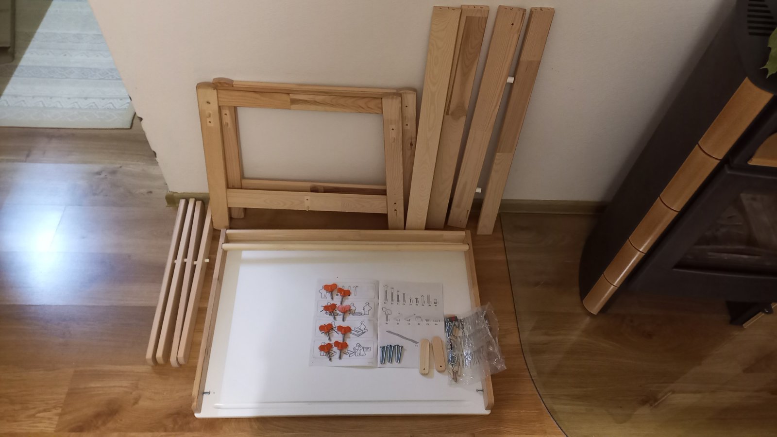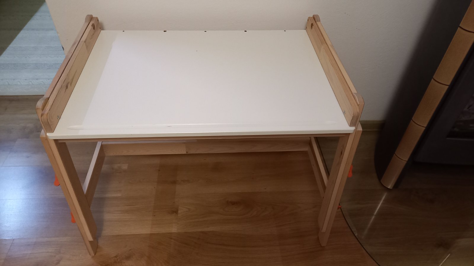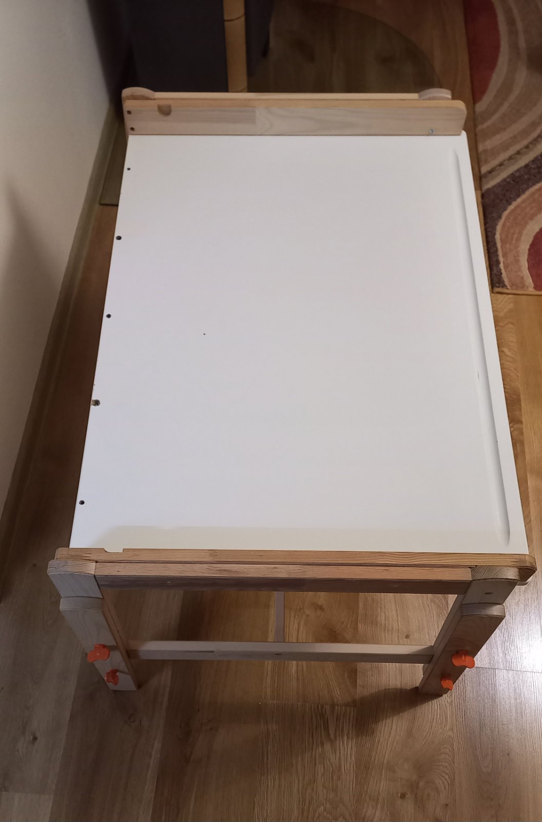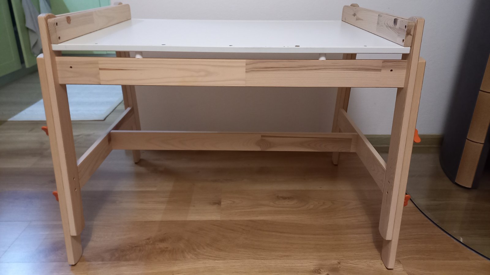 Na predaj máme iba stôl. Mali sme ho zmontovaný tak, aby z každej strany mohlo sedieť jedno dieťa. Stôl má známky používania, z boku na jednej strane sú dierky zo skrutiek, bol tam uchytený závesný organizér. Stôl má tri rôzne výšky.
