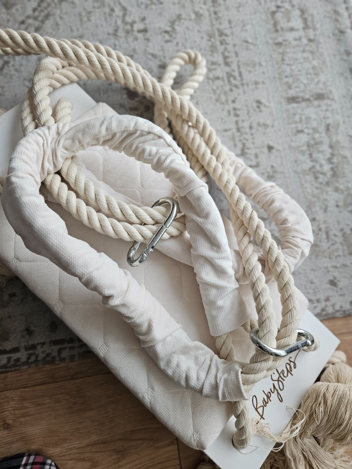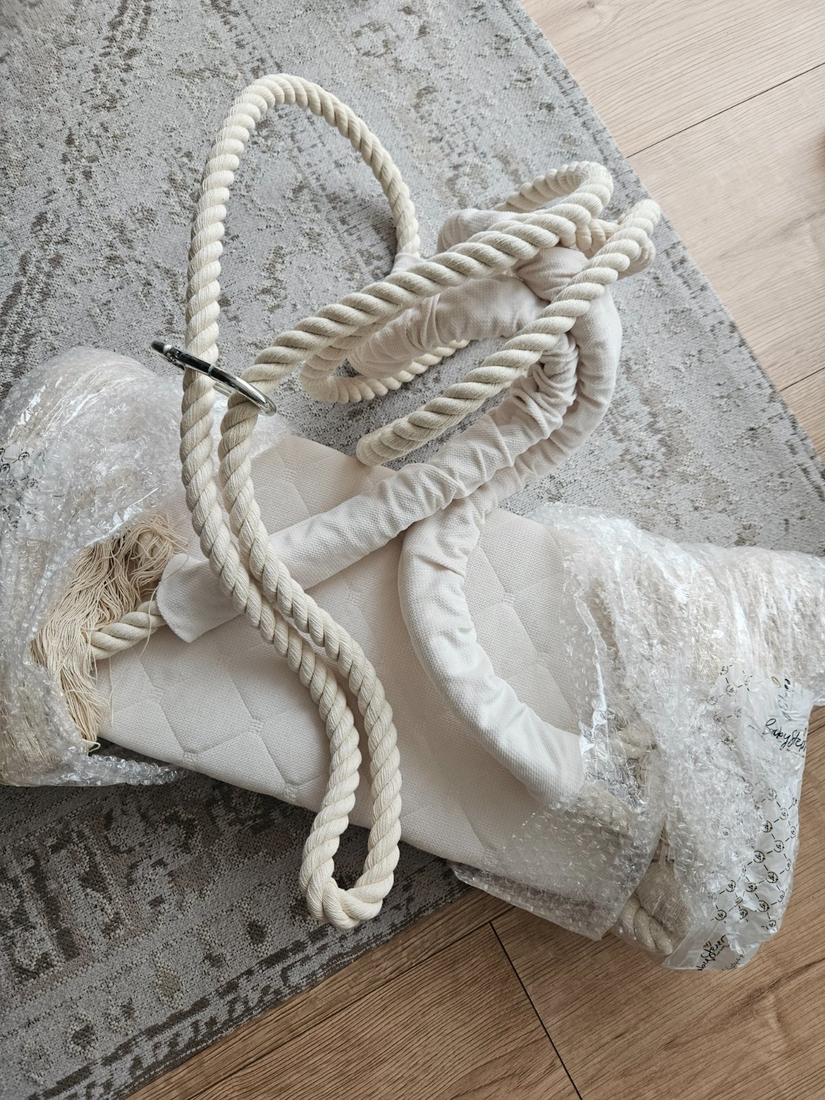 Celá hojdačka má dĺžku 250 cm, je nastaviteľná samozrejme. Uzlami na lane zo spodnej strany si regulujete v akej výške chcete mať sedaciu časť od zeme.