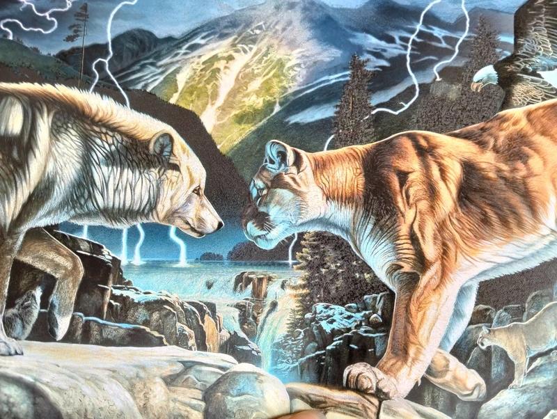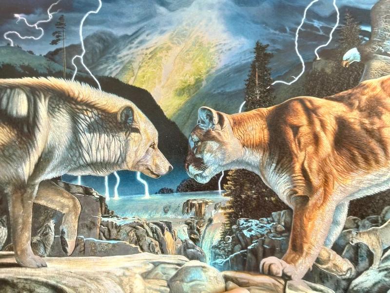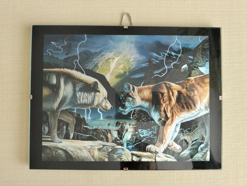 Krásny obrázok americkej divočiny, puma verzus vlk. Obrázok je lesklý s 3D efektom, mení intenzitu farieb a lesku podľa uhľa pohľadu. Posielam v sklenom ráme. Rozmer 24 x 18 cm.