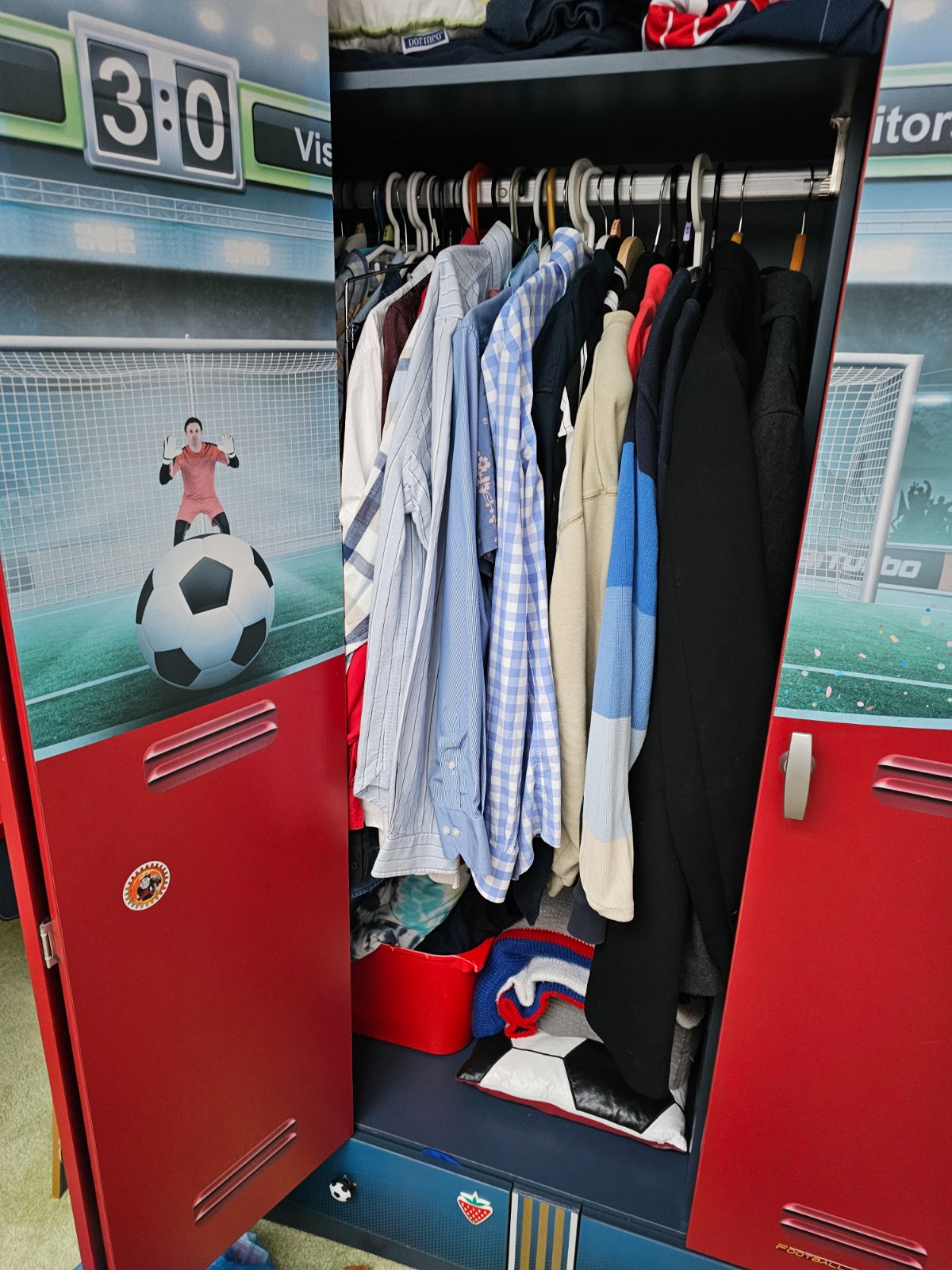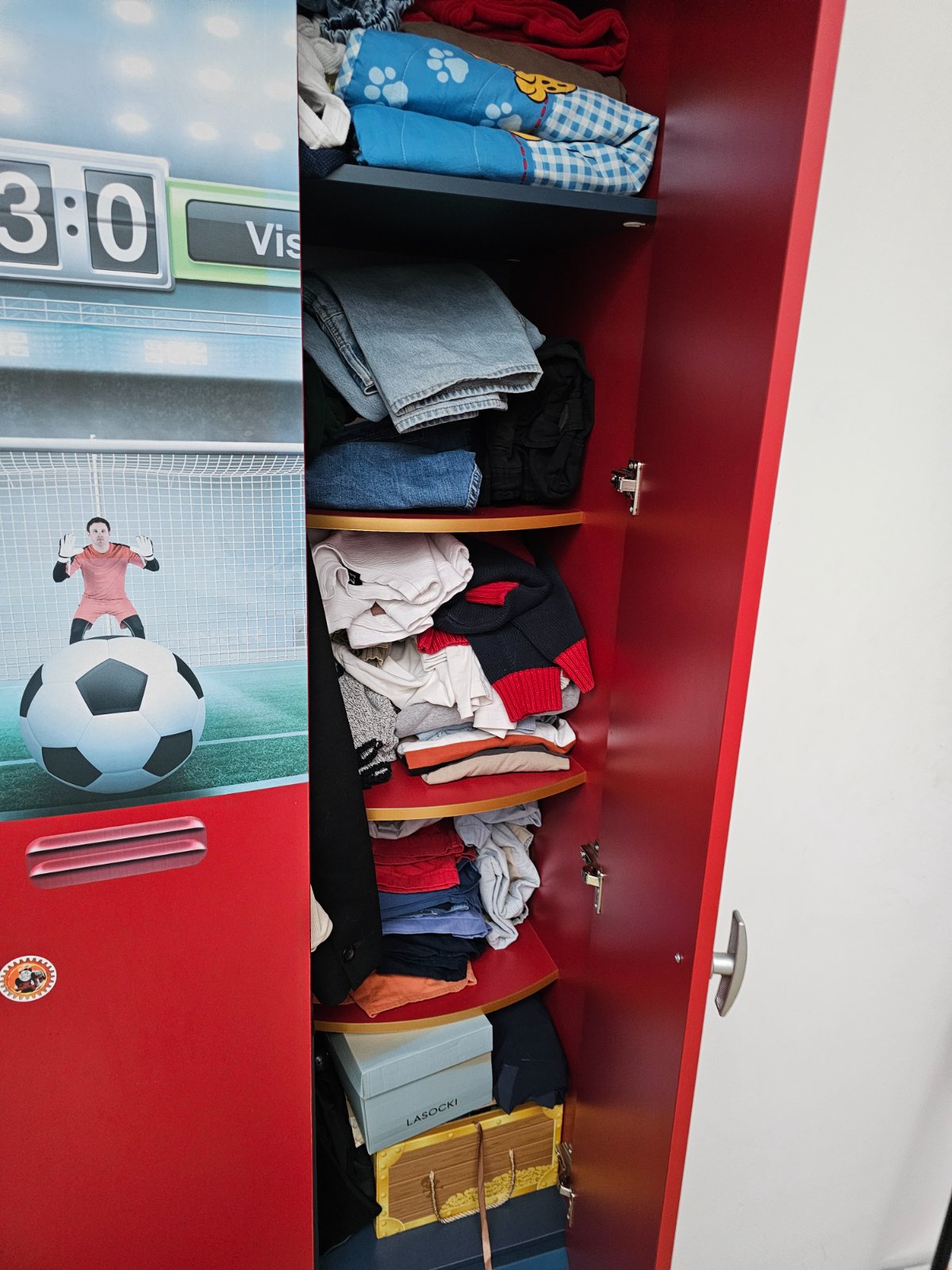 3dverová skrina, vpravo policky, vlavo hore policka, tyc na vesiaky a dolna policka. Naspodu pod celou skrinou 2 sufliky. Menené uchytky, nakolko povodne sa rychlo lamali, tak som menila za futbalove. Vyska 209, sirka 120,8cm, hlbka 52,5 cm.