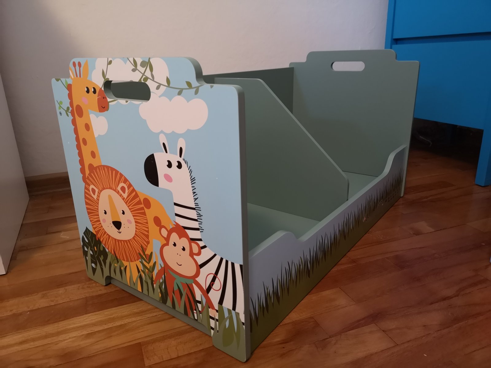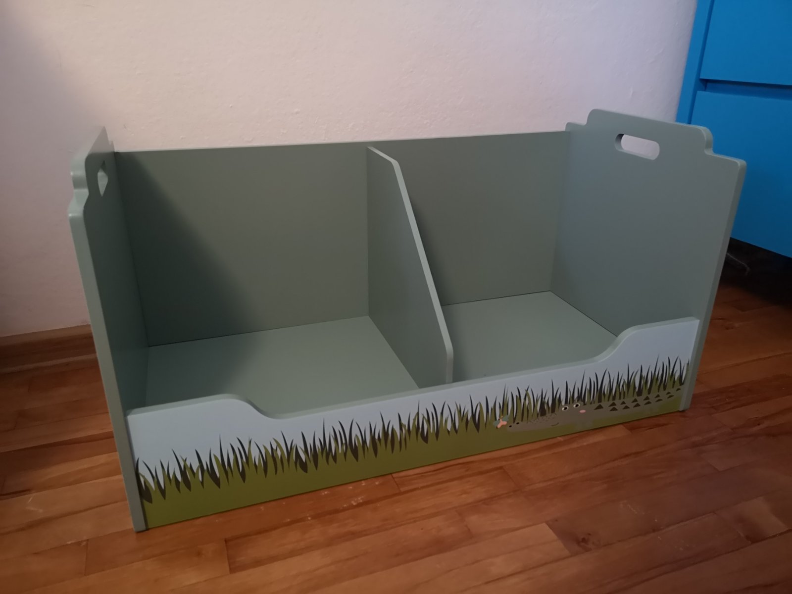 Ideálny do detskej izby. Ponúka množstvo úložného priestoru na knihy, hračky alebo plyšové zvieratká. Stabilná konštrukcia s dvomi rukoväťami. Dodatočná deliaca stena pre väčšiu prehľadnosť. Pre úsporu miesta možné stohovať s ďalšími regálmi na seba Rozmery cca 76,5 x 38 x 40 cm (D x Š x V).
