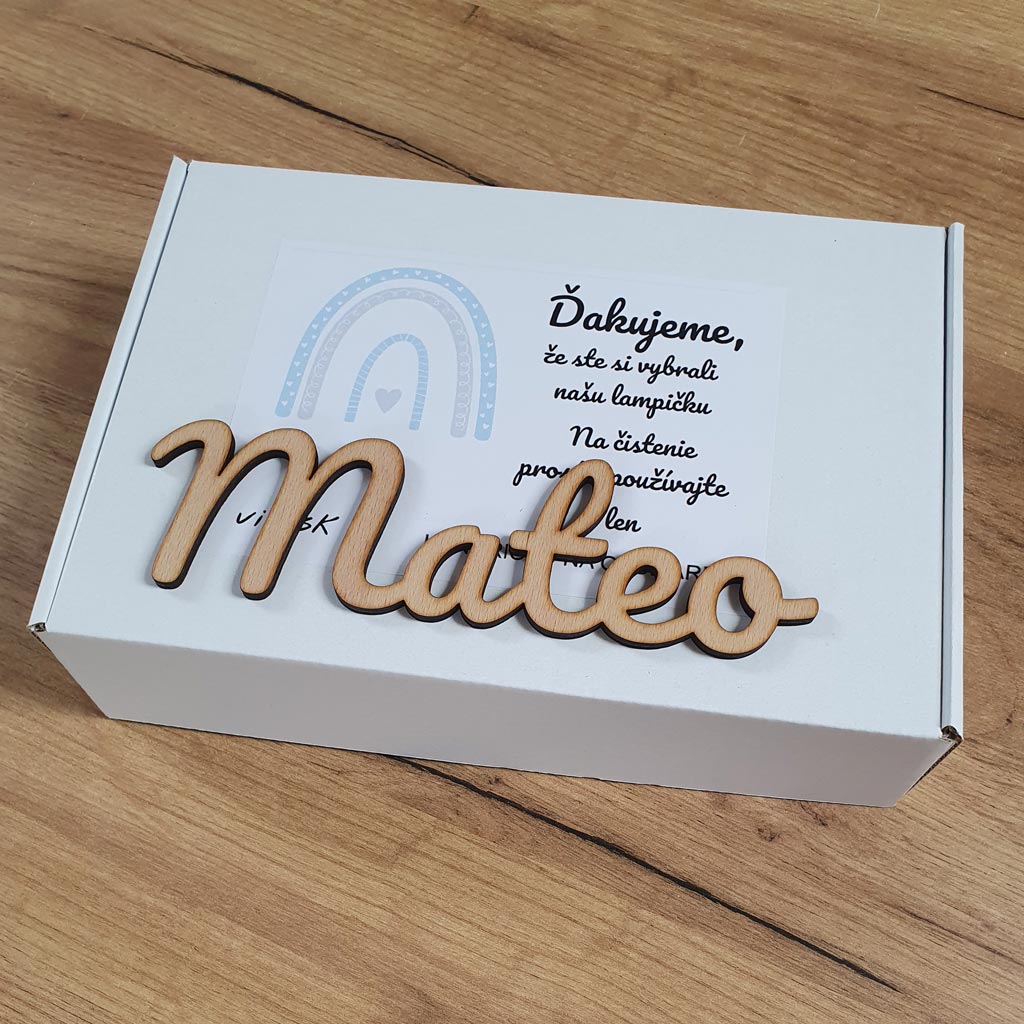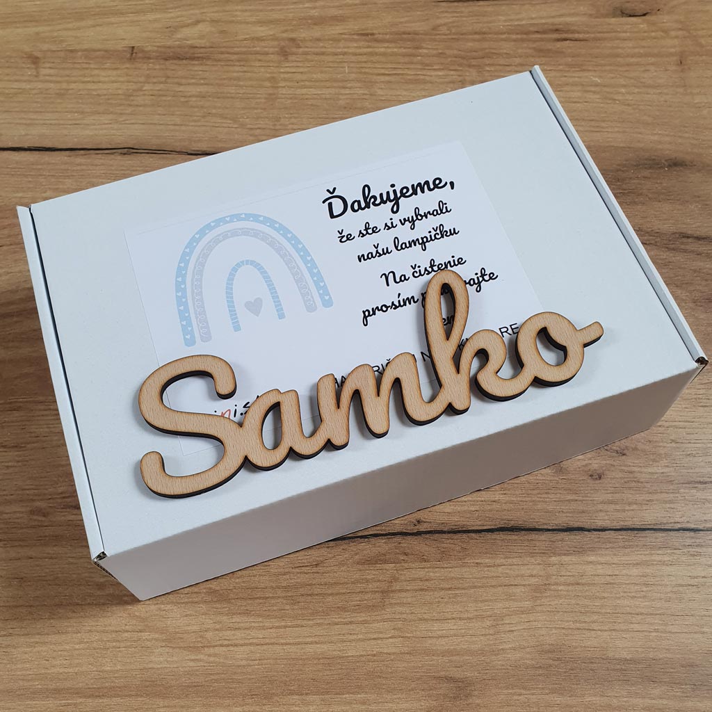 Meno dieťatka napíšte do políčka pri výrobku. Ak si prajete pridať venovanie aj na drevený podstavec lampičky, tak stačí označiť možnosť (Gravírovanie na podstavec + 5 €) a napísať želaný text. Po prijatí objednávky Vám pošleme na email meno aj Váš text vo viacerých typoch písma na výber.