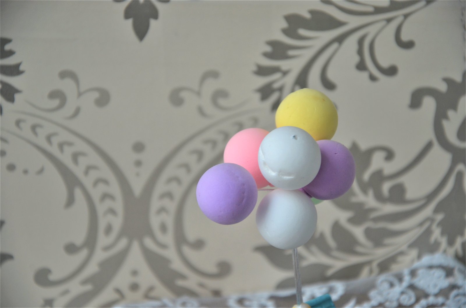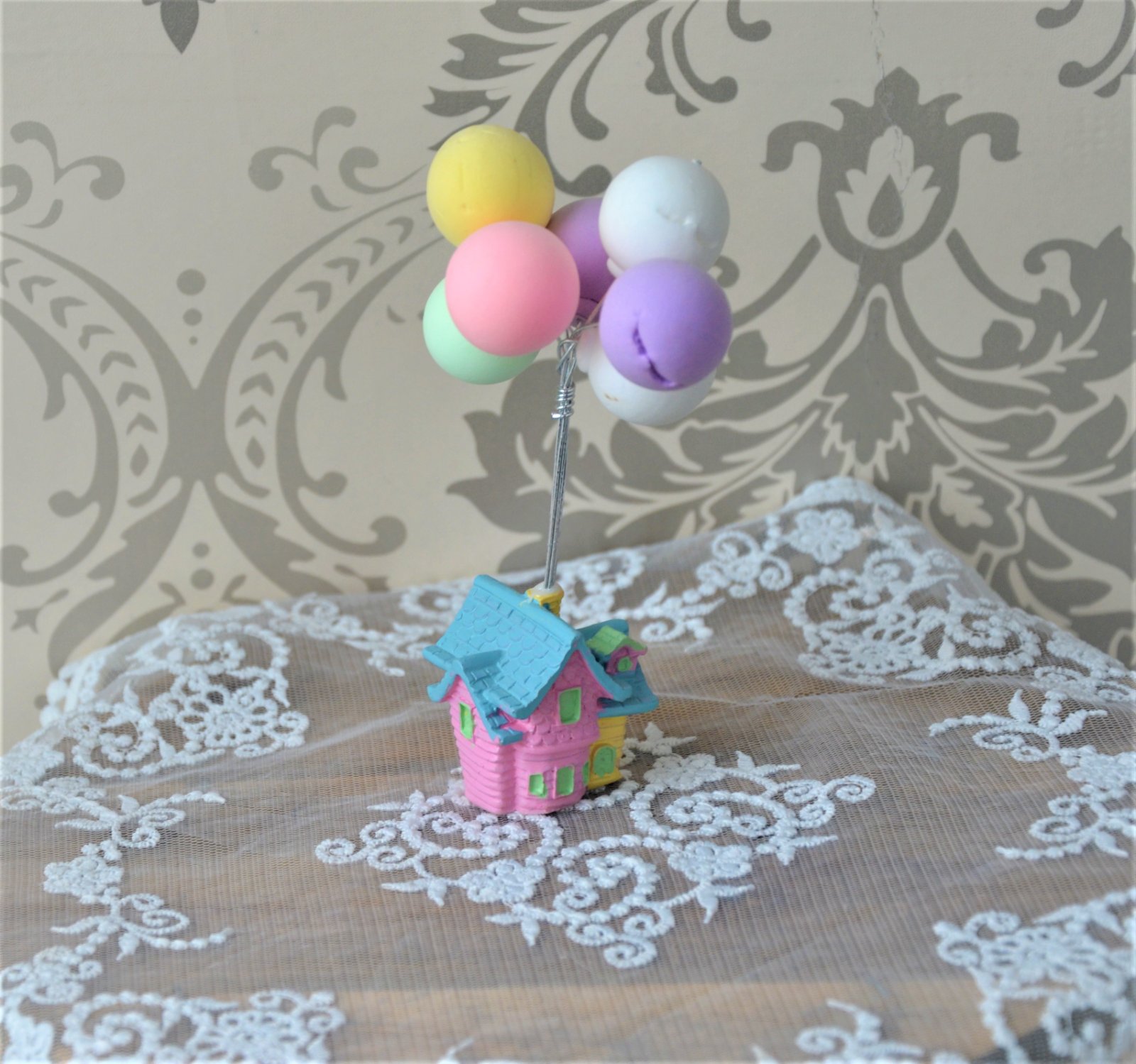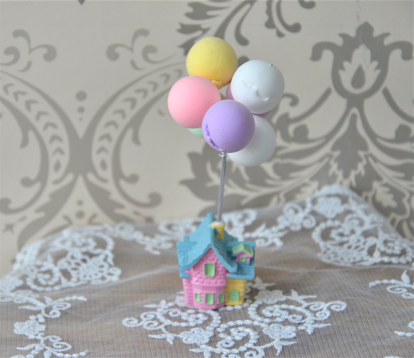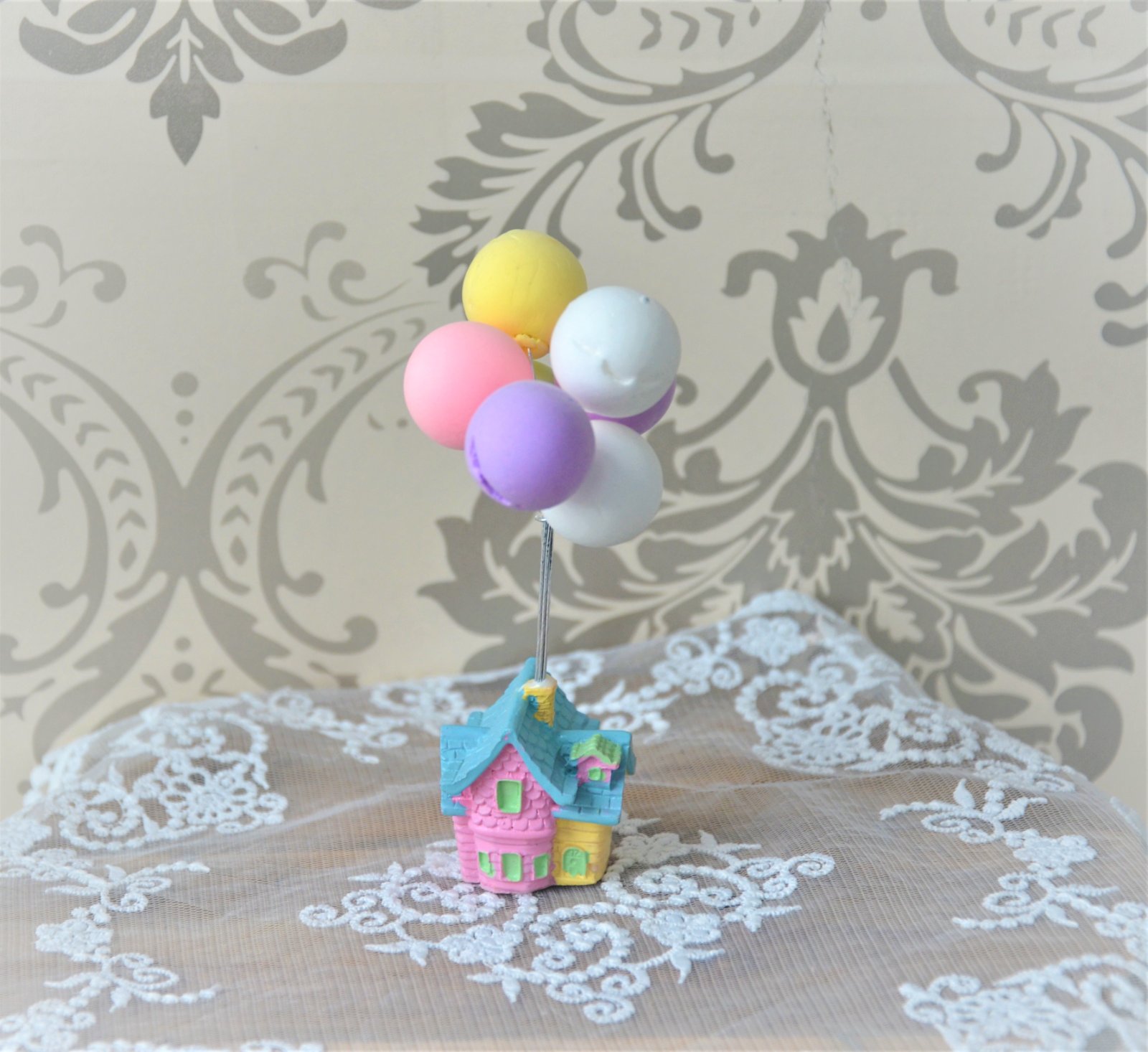 malá dekorácia s balónikmi z polystyrénu,balóniky sú skladovaním miestami otlačené-domček polyrezín-celková výška 13cm,samotný domček 4x4cm...kuk aj na iné moje inzeráty