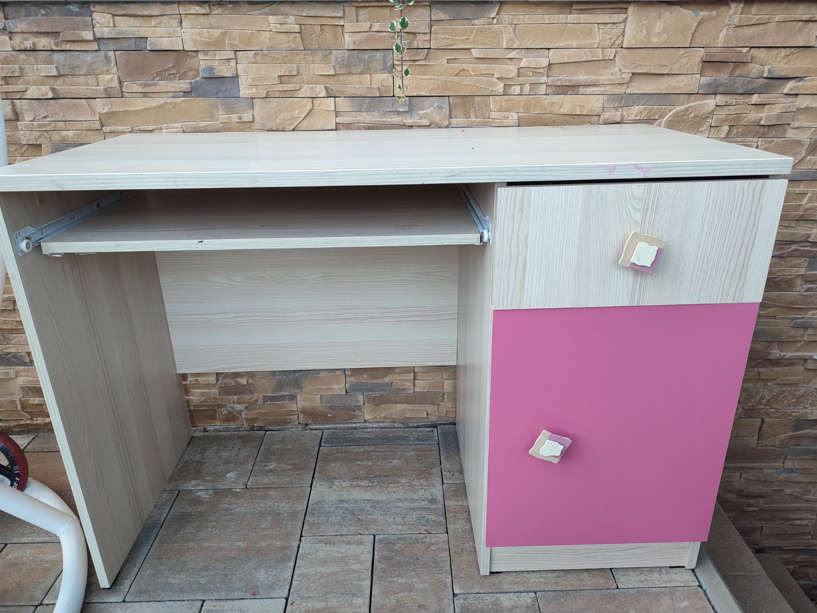 Nádherný dievčenský písací stôl, robený na mieru, stolárstvo Falat z Bardejova. Kontajner má nádherné rúčky, je možné ho umiestniť aj vpravo aj vľavo, je na kolieskach. Farba svetlé drevo a svetloz...