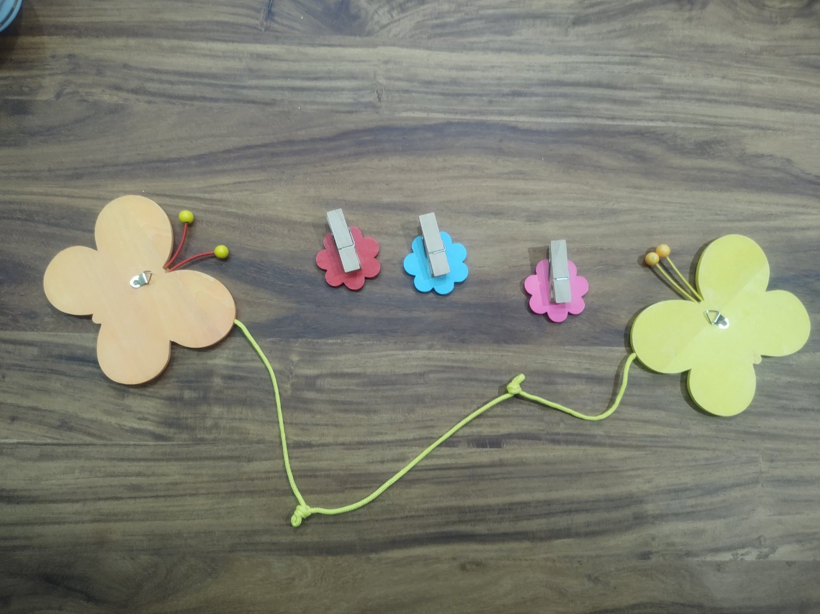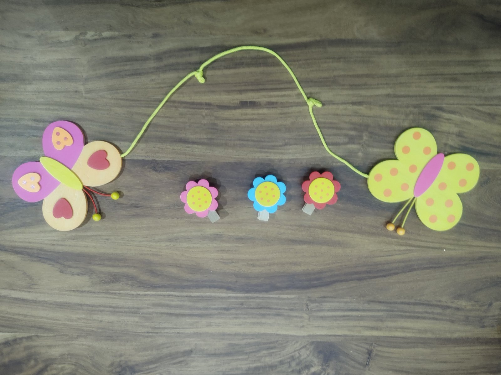 Dva motýliky spojené šnúrkou na zavesenie 3 štipcov - kvetiniek.