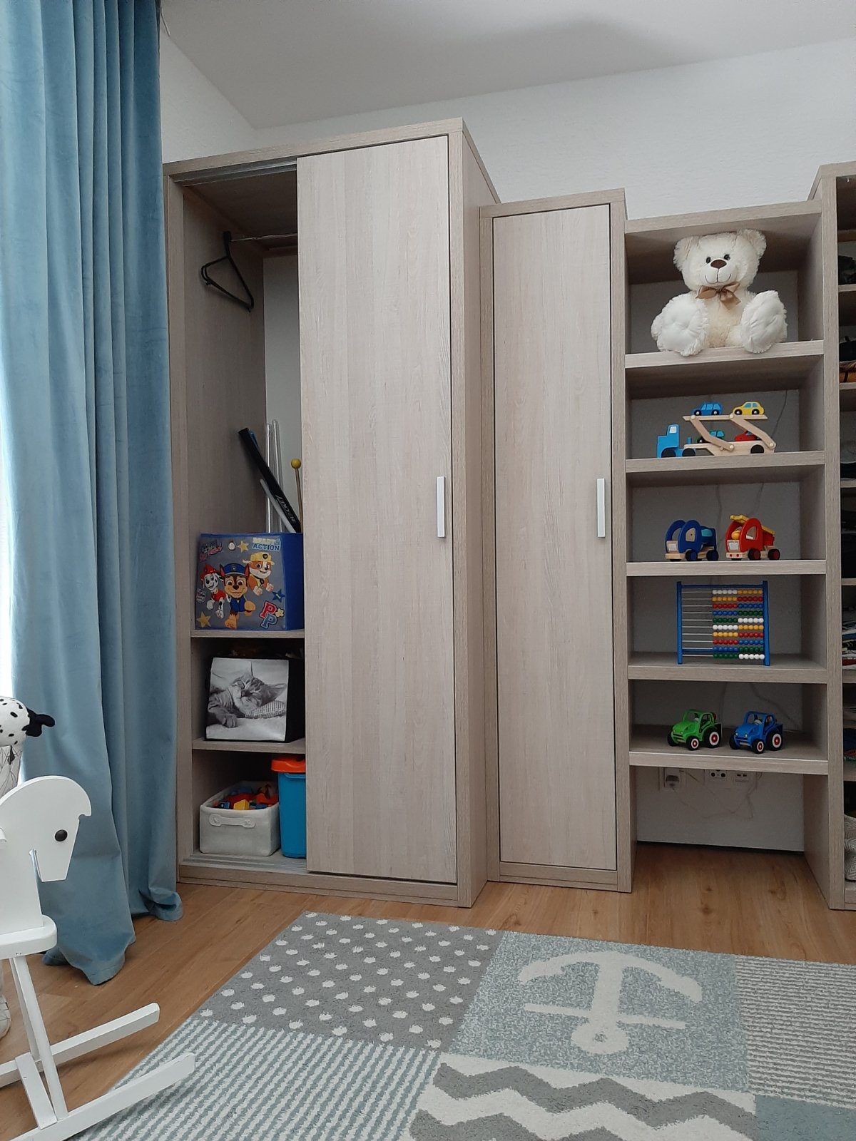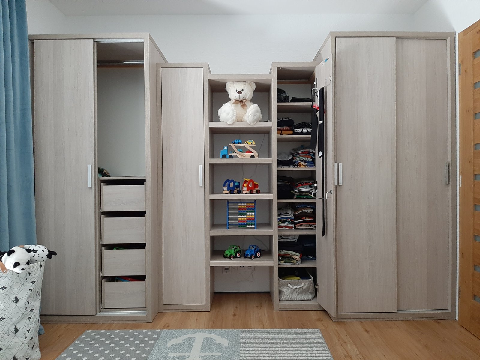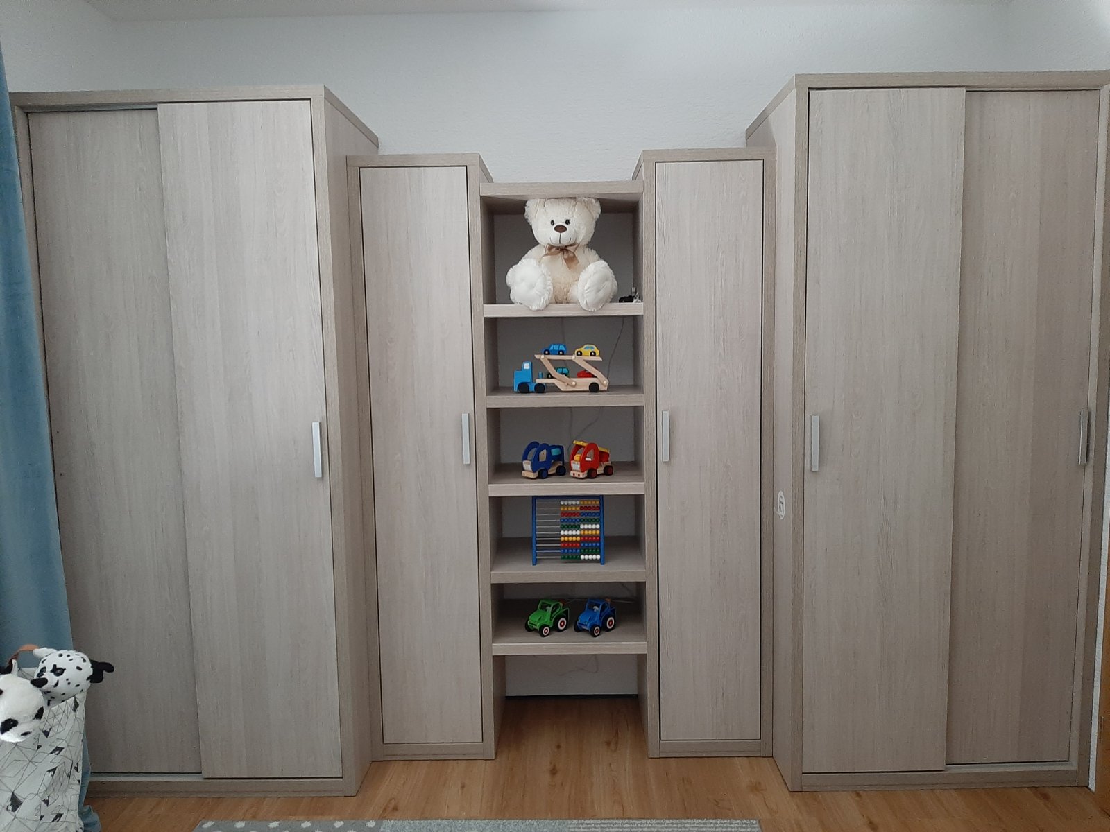 Predám kvalitný nábytok do detskej izby (Bočné najväčšie skrine už predané). Nábytok robený na mieru. V prípade vážneho záujmu zašlem rozmery. Zostava obsahuje: