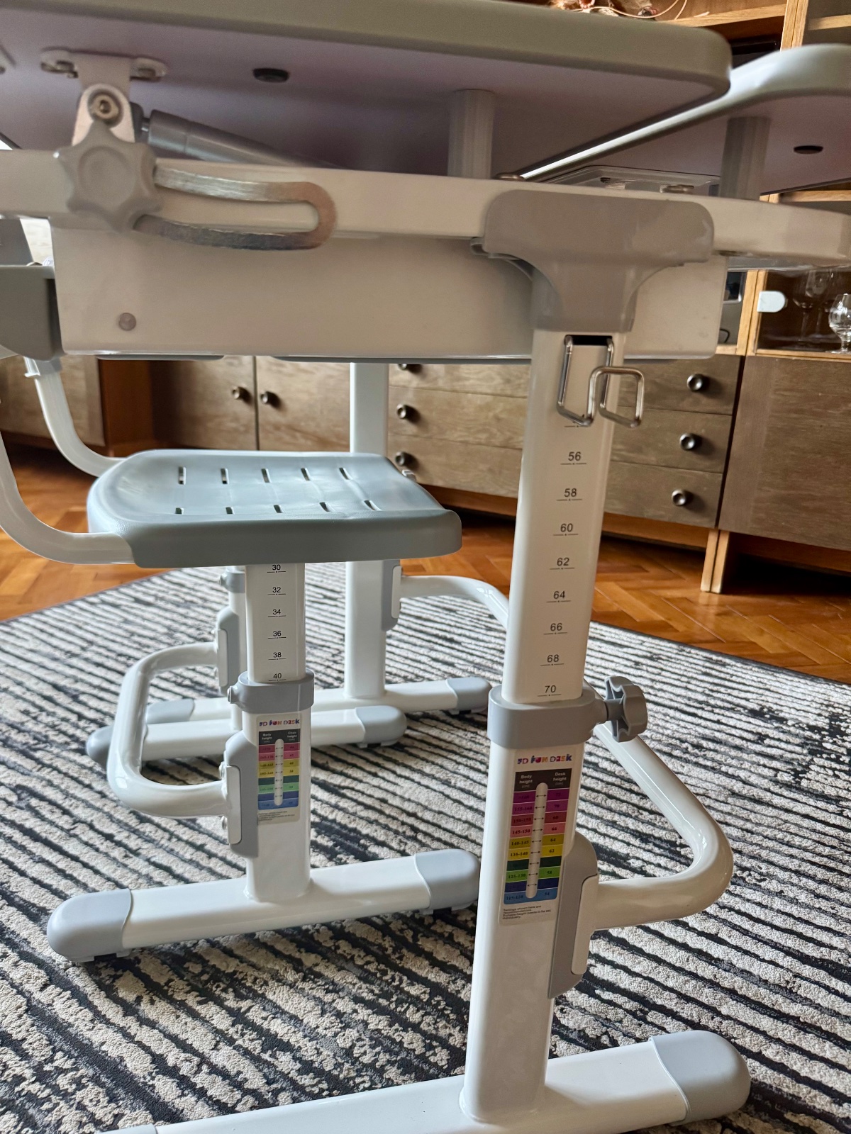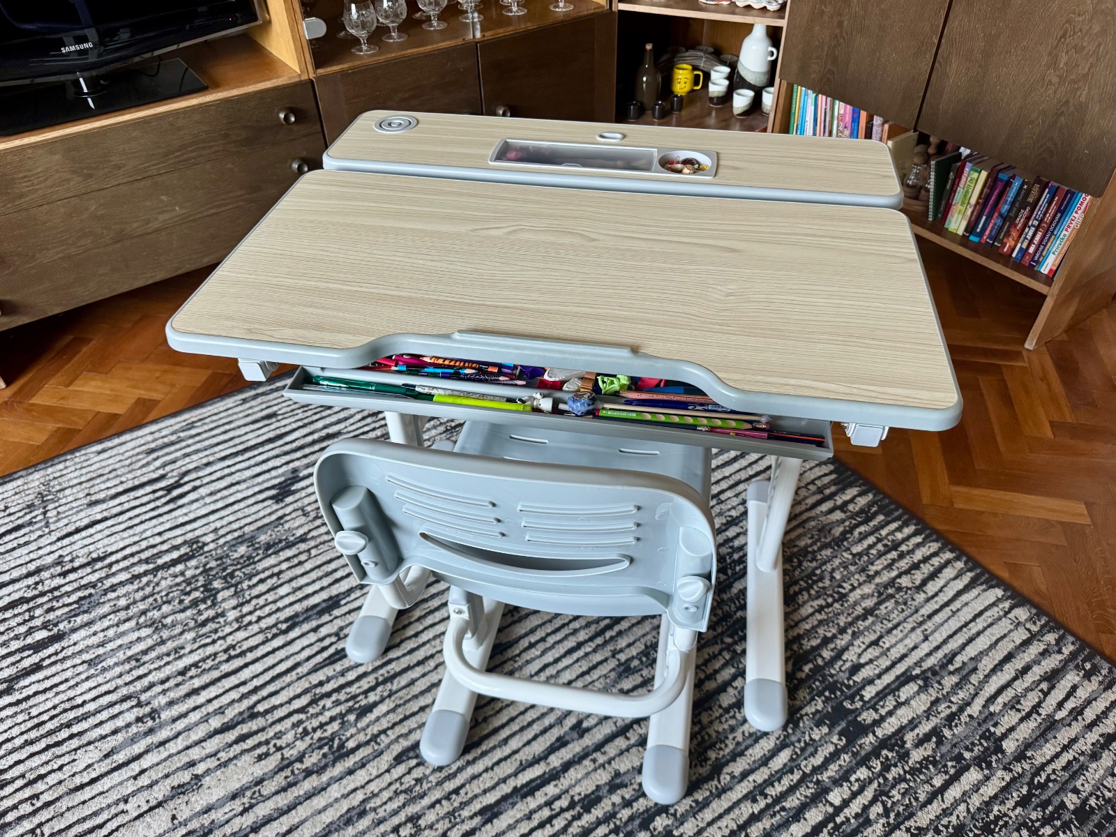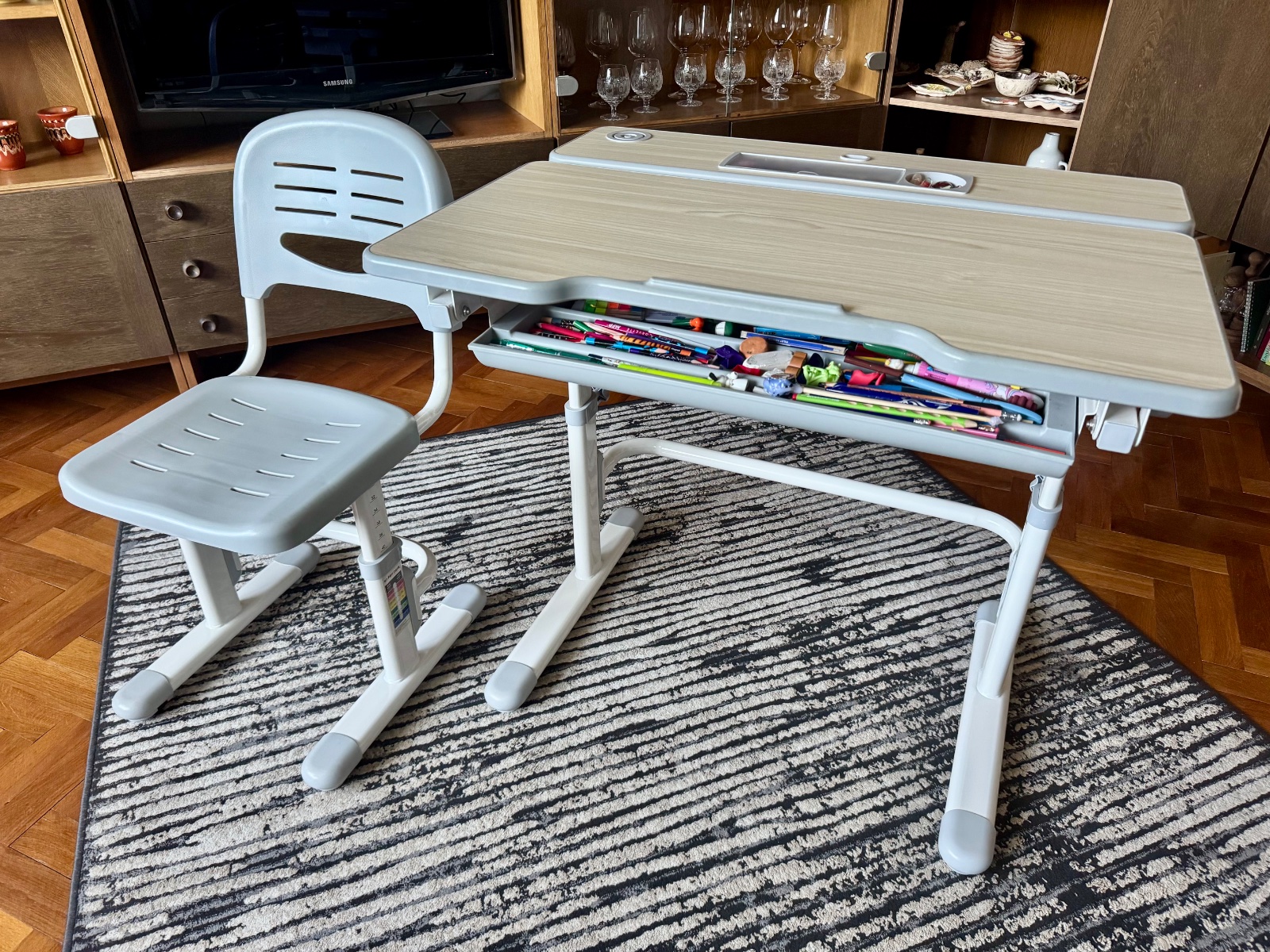 Moderný ergonomický stôl a stolička s nastaviteľnou výškou, sklopnou pracovnou doskou a výsuvnou zásuvkou na písacie potreby. Je možné zapojiť lampu do rohu stola.