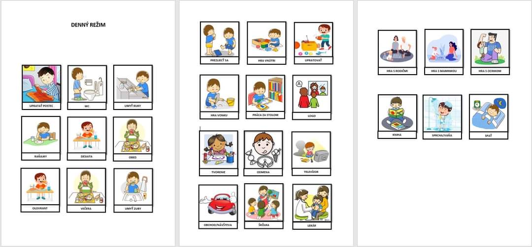 Ponúkam PDF súbor na vytvorenie Denného režimu pre dieťa. Obsahuje 27 obrázkov základných činností (viď foto). Na uvodnej foto ukážka toho nášho. Rozmer obrázka je cca 5,5cm x 5cm. Viem poslať aj ako hotový produkt. Tam je cena 8€.