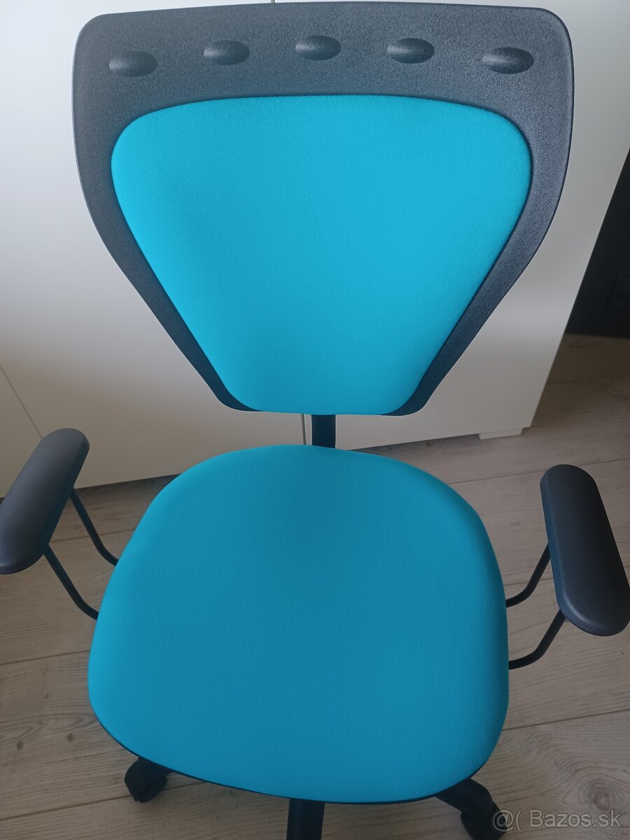 Detská otočná stolička s možnosťou hmotnosti do 45 kg. Nastavitelná výška sedadla,výškové nastavenie operadla, nastavenie vzdialenosti medzi operadlom a sedadlom, pevné lakťové opierky, päťramenná nylonová základňa s kolieskami pre deti v školskom veku. Stolička je úplne nová zo zariadej, ale nepoužívanej detskej izby.