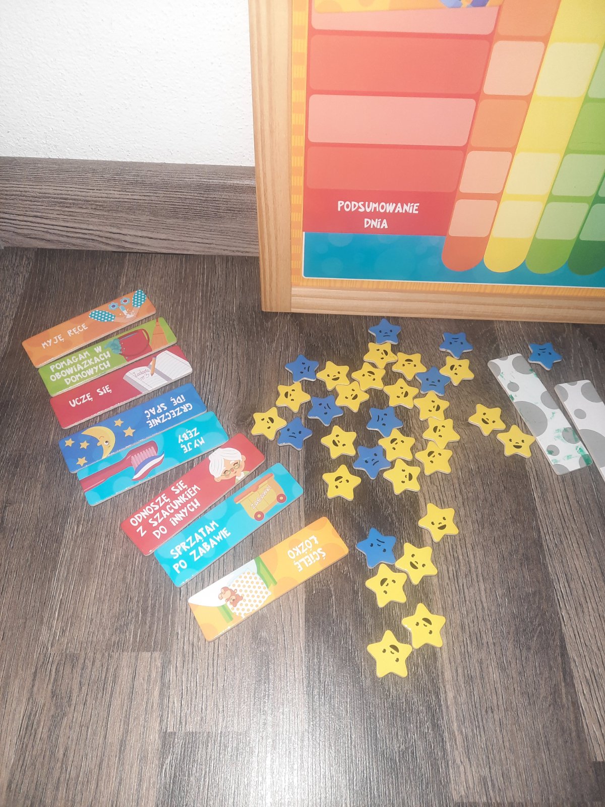Magneticka motivacna tabula, obsahuje cinnosti ako aj body za odmenu(hviezdicky usmiate ale aj smutne). Jazyk polstina. Dieta motivuje ku plneniu ukolov, dieta nemusi vediet citat, obrazky cinnosti su zobrazene