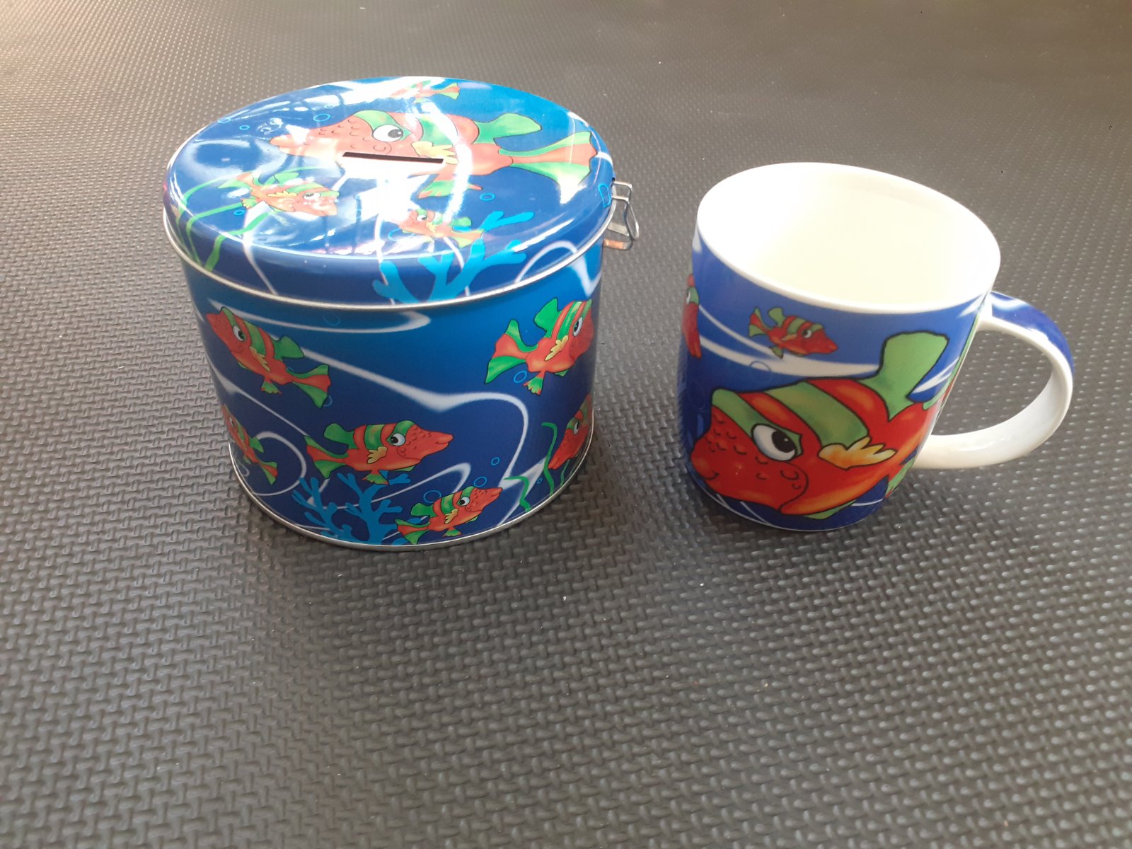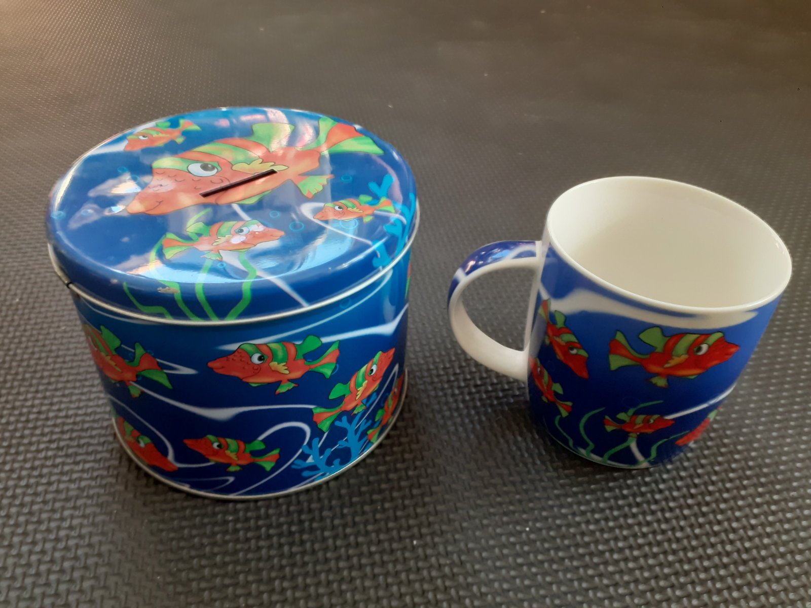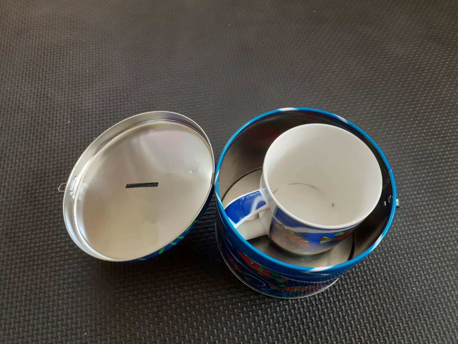 Darujem ku objednávke alebo za poštovné porcelánový hrnček s plechovou pokladničkou. Motív ryby, modro - červená farba. Používané ale stále pekné a funkčné.