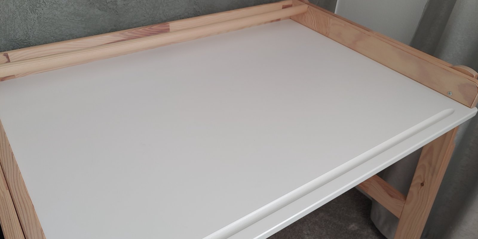 Detský písací stôl IKEA FLISAT z masívneho dreva, pracovná doska drevotrieska. Stôl je vo výbornom stave, bez poškodenia. Pracovná doska tiež bez poškodenia, používali sme podložku na stôl. Nastaviteľná výška stola na 3 polohy (52cm, 61cm a 71cm). Pracovnú dosku je možné nastaviť aj do šikmej polohy. Stôl má držiak na rolku papiera na kreslenie IKEA MALA. Stôl sa predáva bez doplnkov (boxy a stolička).