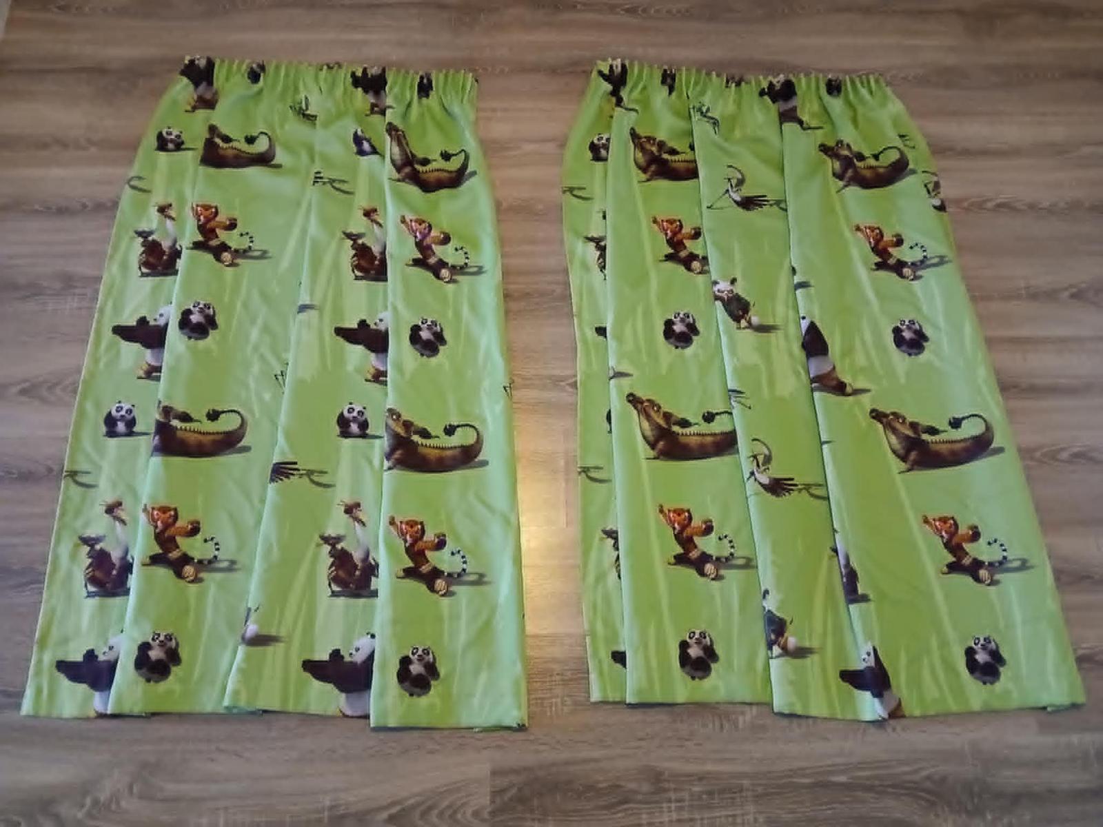 Na predaj závesy, sv. zelené, detský motív/Kung fu panda/. V-140cm, D - vrch 77cm/nariasené/, D - spodok 143 cm. Zatemňovacie.Zdarma + záclona. Rovnaká dlžka. Použité, bez poškodenia. 15e, Kvetoslavov