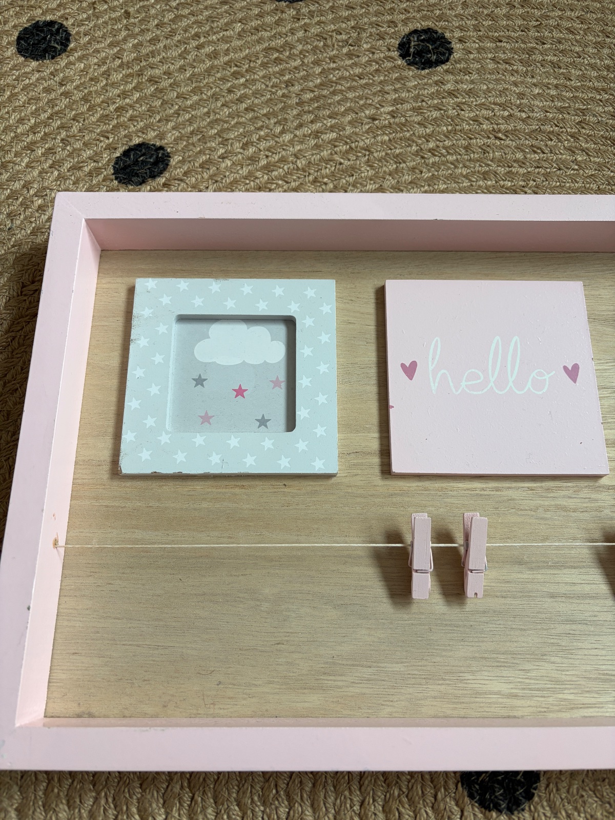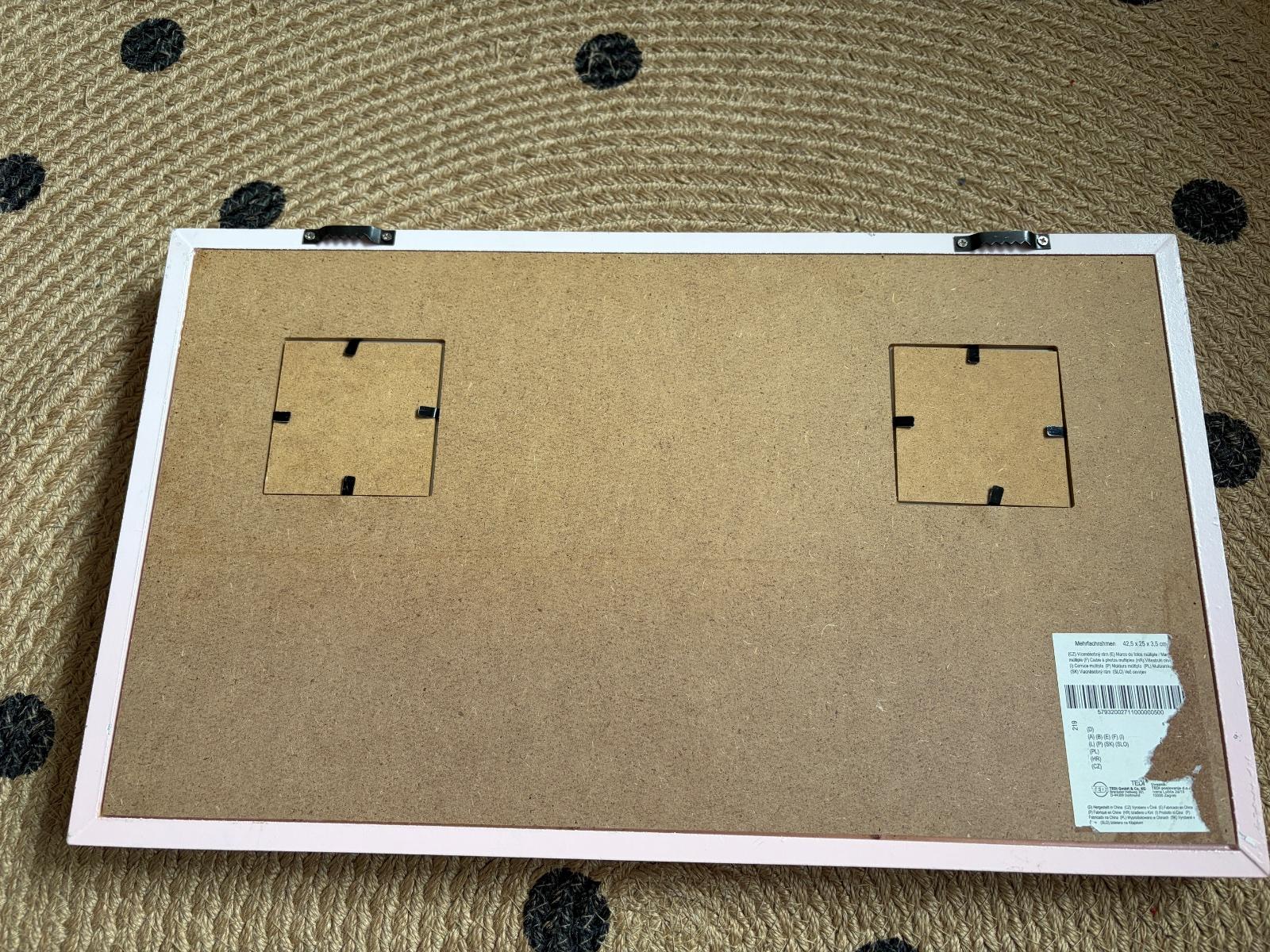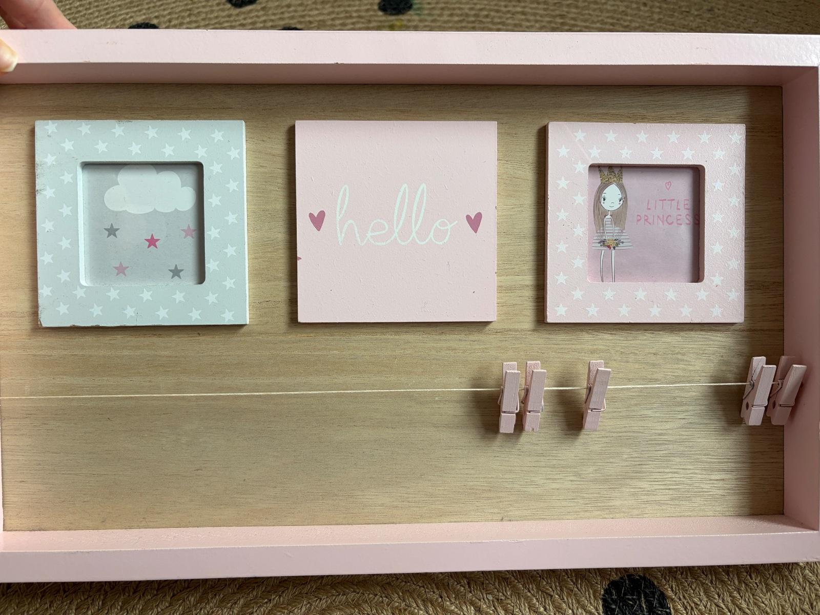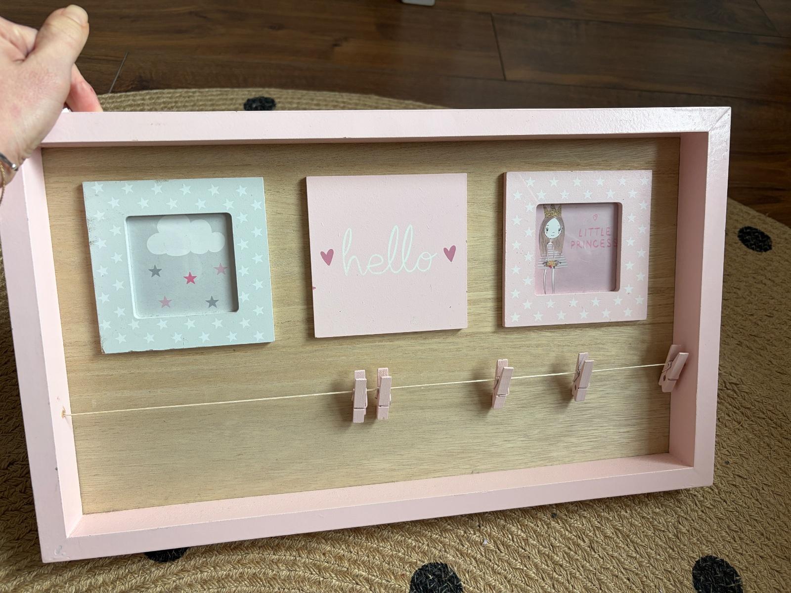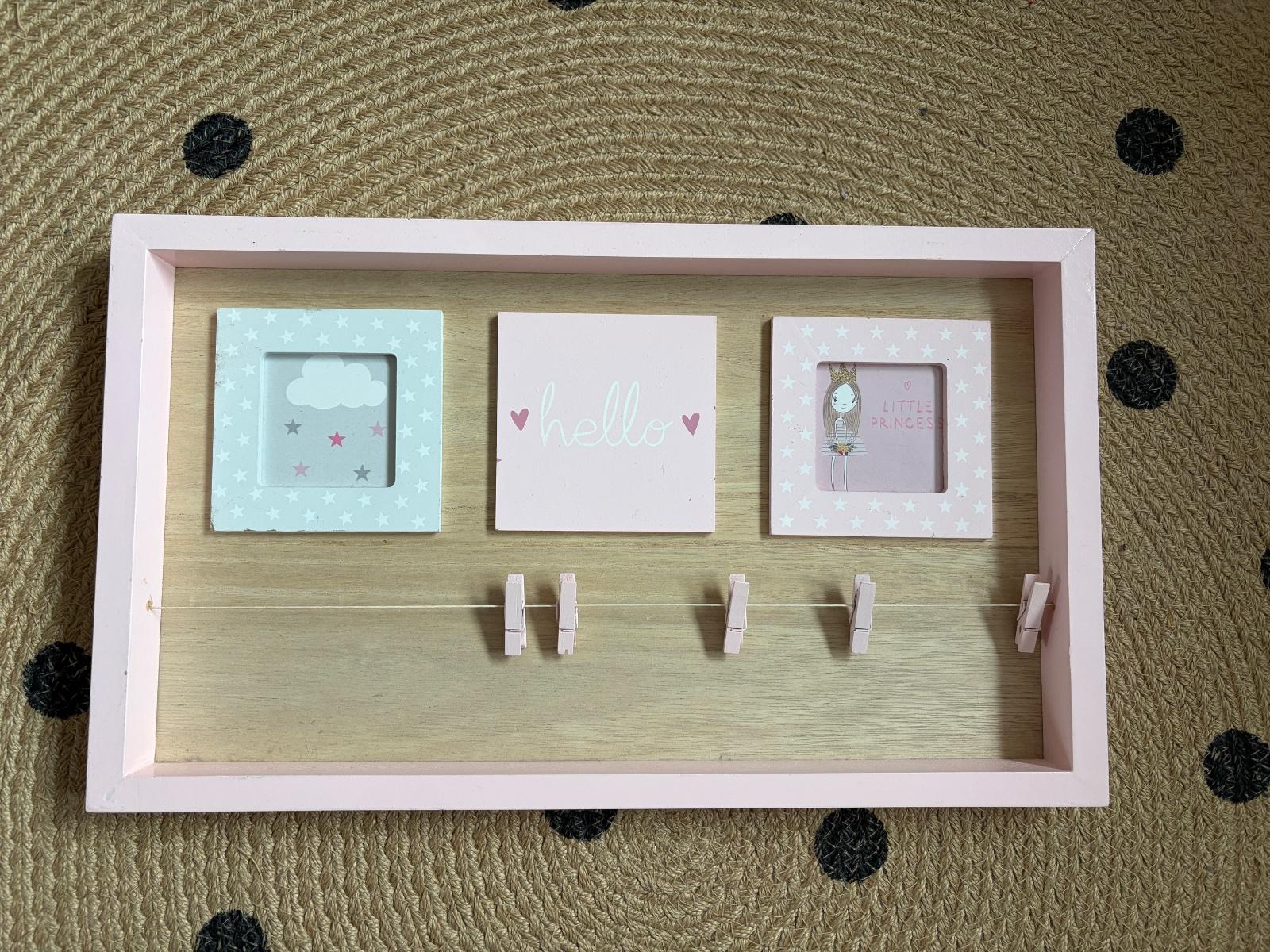 Predám rám na fotky, vhodný do detskej izby. V ráme sú 2 okienka na vloženie fotiek + sa fotky dajú prichytiť pomocou štipcou. Veľmi pekné a milé na uloženie pekných spomienok. Rozmer 42,5x25x3,5 cm. Všetko vidno vo fotkách.