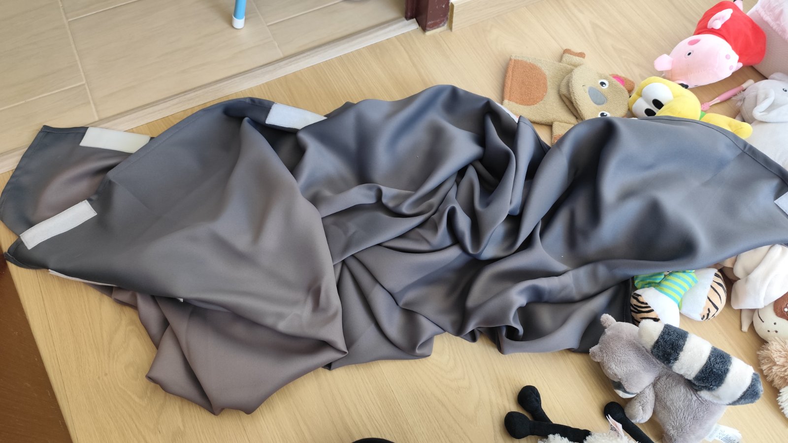 Prenosný zatemňovací záves, tmavošedý, ktorý nemusíte zložito inštalovať alebo vŕtať, keďže sa pripevňuje samolepiacim suchým zipsom rovno na rám okna. My sme maximálne využili na denné spánky, keď boli deti malé. Šitý na zákazku, presne na bytové okno, veľkosť 140x194 cm, vidieť známky používania (žmolky, občas vytiahnutá nitka), estetické vady, funkčnosti to nevadí.