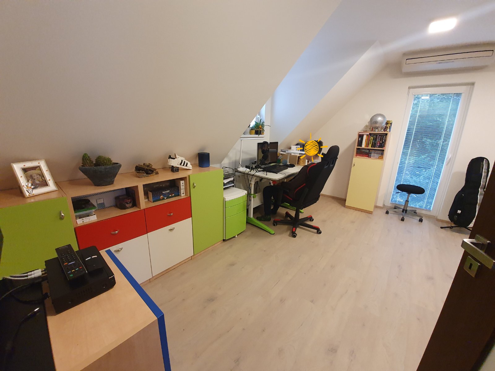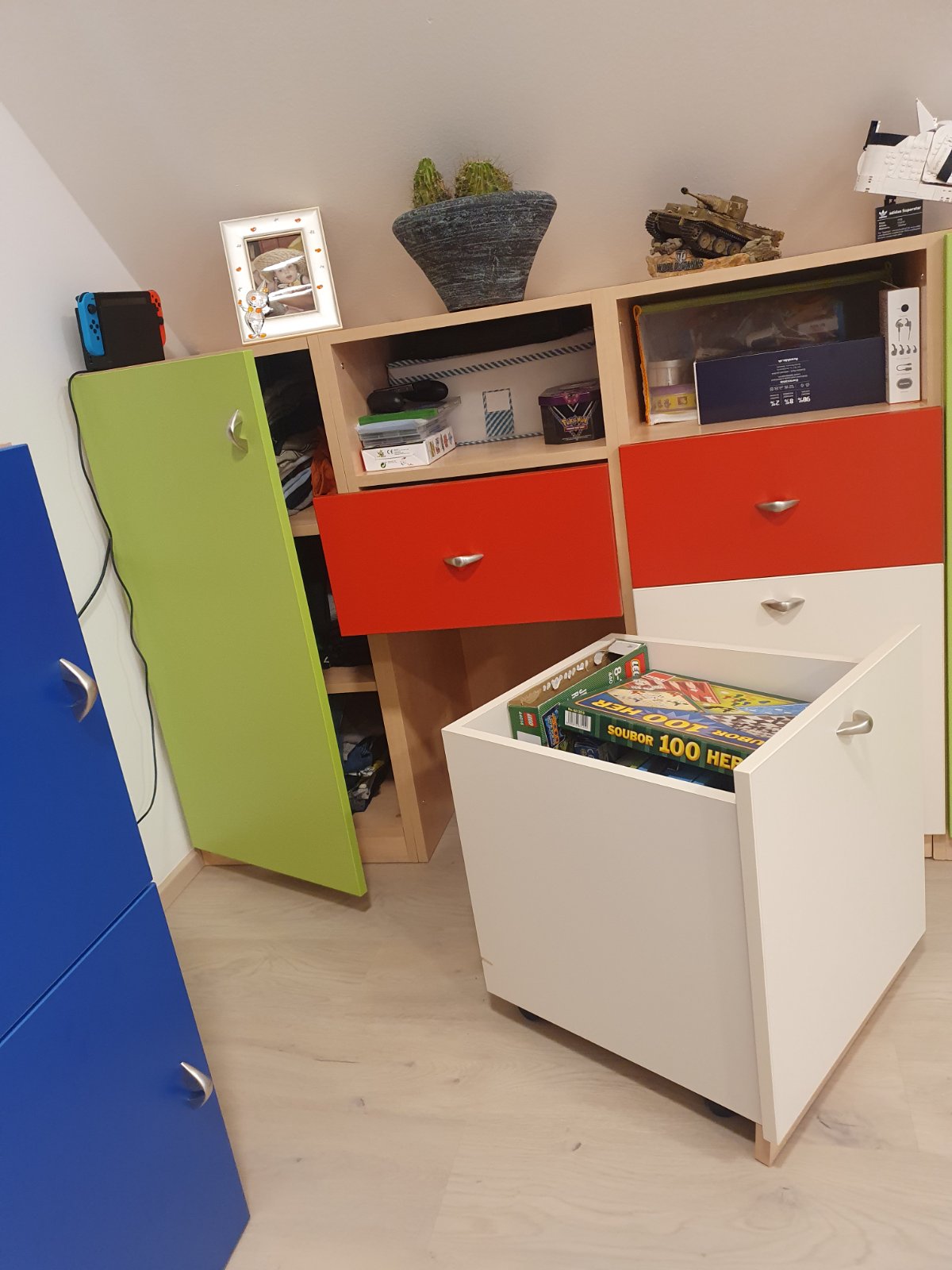 Nábytok vo výbornom stave pre chlapca aj dievča. Veľmi praktický pre oblečenie, hračky, knihy. Skladá sa zo siedmich vysokých skriniek, troch menších skriniek a dvoch poličiek. Je to zostava, ktorá sa dokopy spája ako LEGO stavebnica. V zelených, modrých a v žltej skrinke sú poličky. Červené sú zásuvky s policami a dolné biele sú vysúvacie kontajnery na kolieskach pre hračky. Nábytok bol vyrobený u stolára, veľmi kvalitná robota. Nie je zničený a je bez škrabancov a vád.
